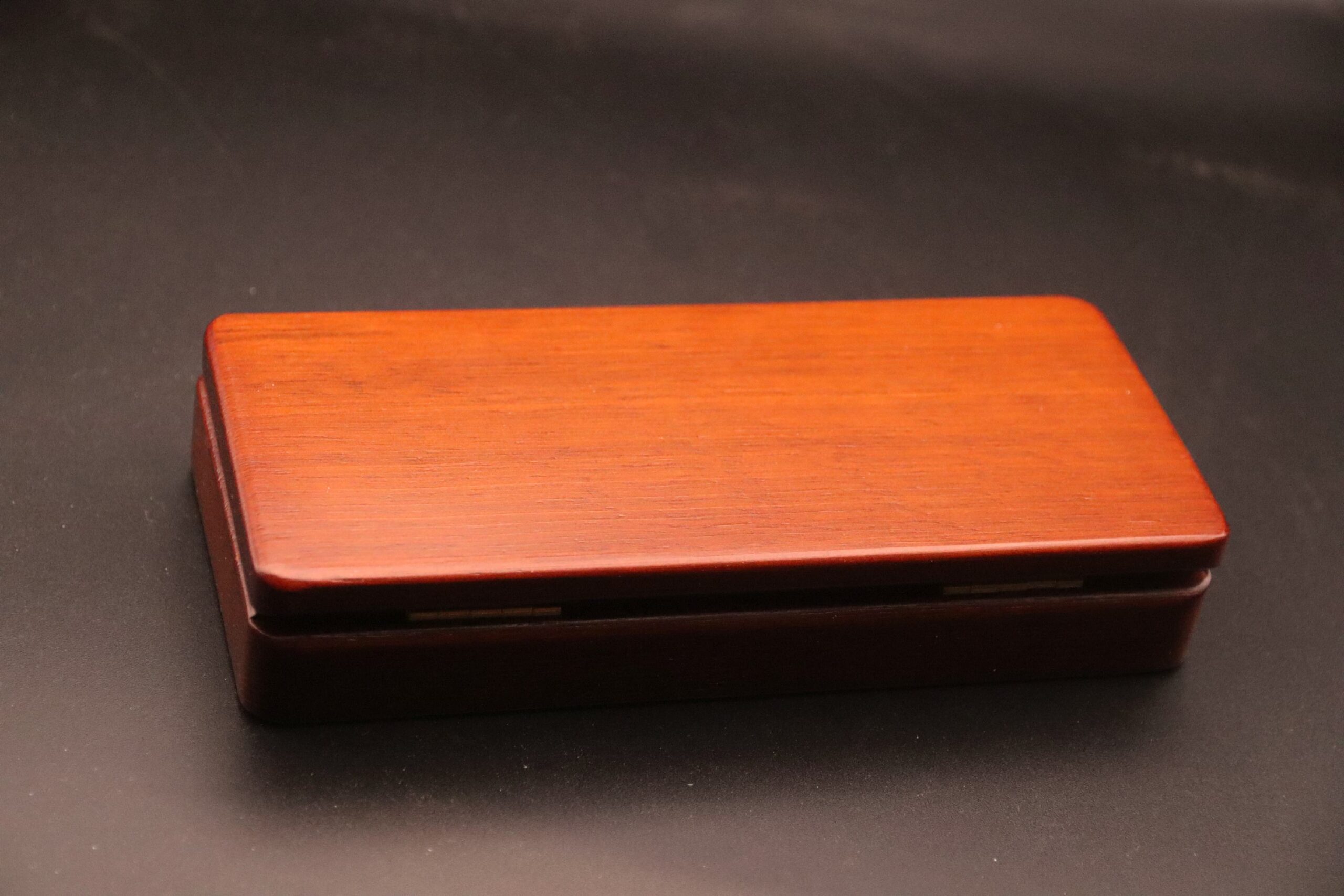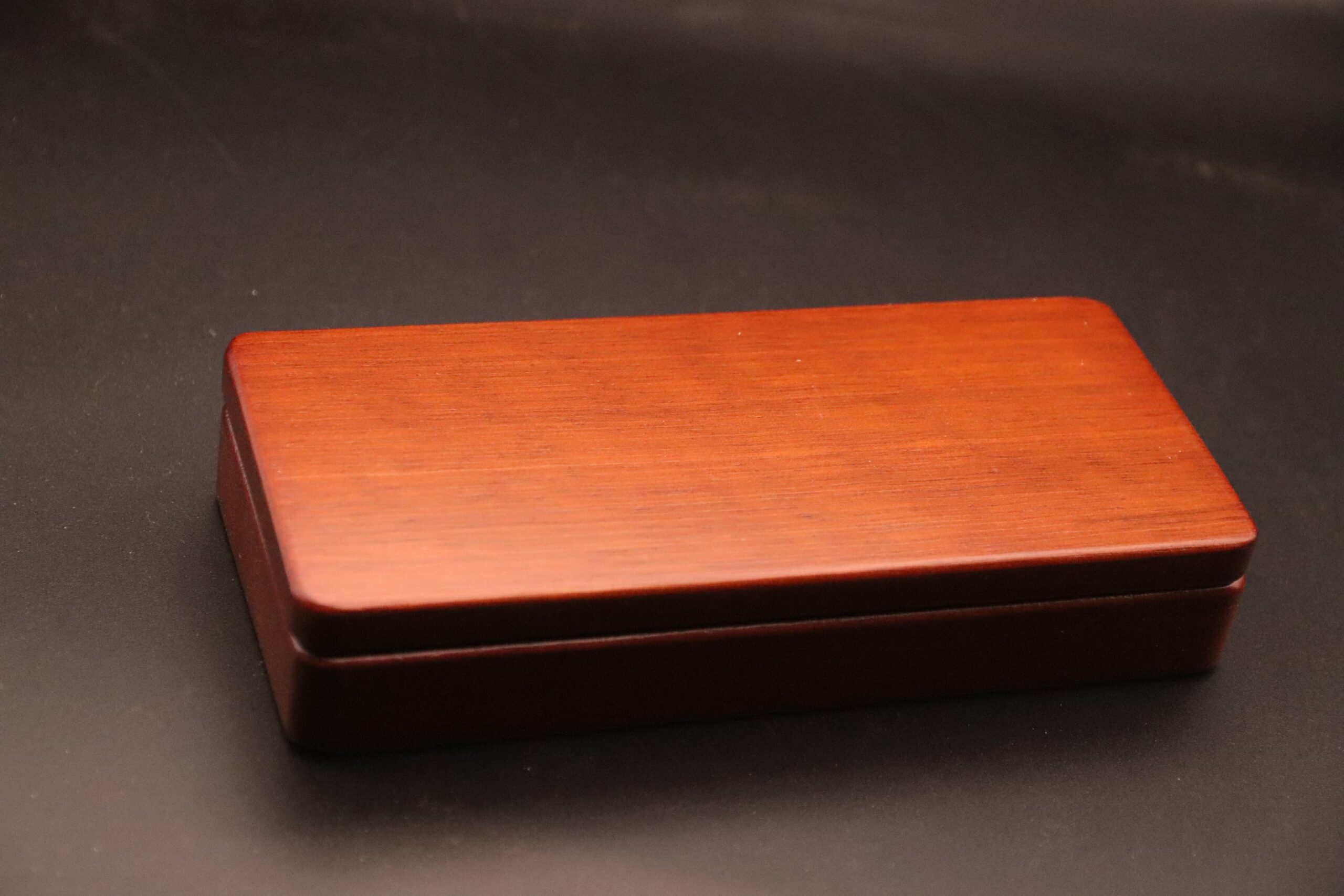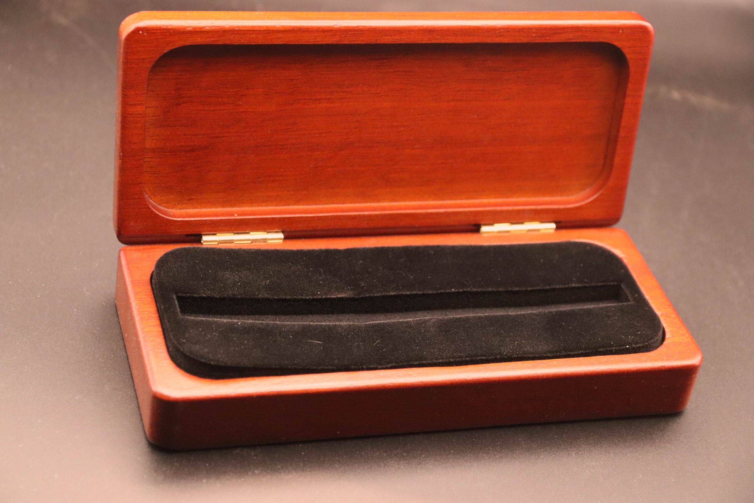 Penneæske i rødt træ – stor. Æsken er lavet i indfarvet mørkt rødt træ. Den er ikke velegnet til store og tykke penne som fyldepenne og rollerballs, da låget så ikke kan lukke helt.