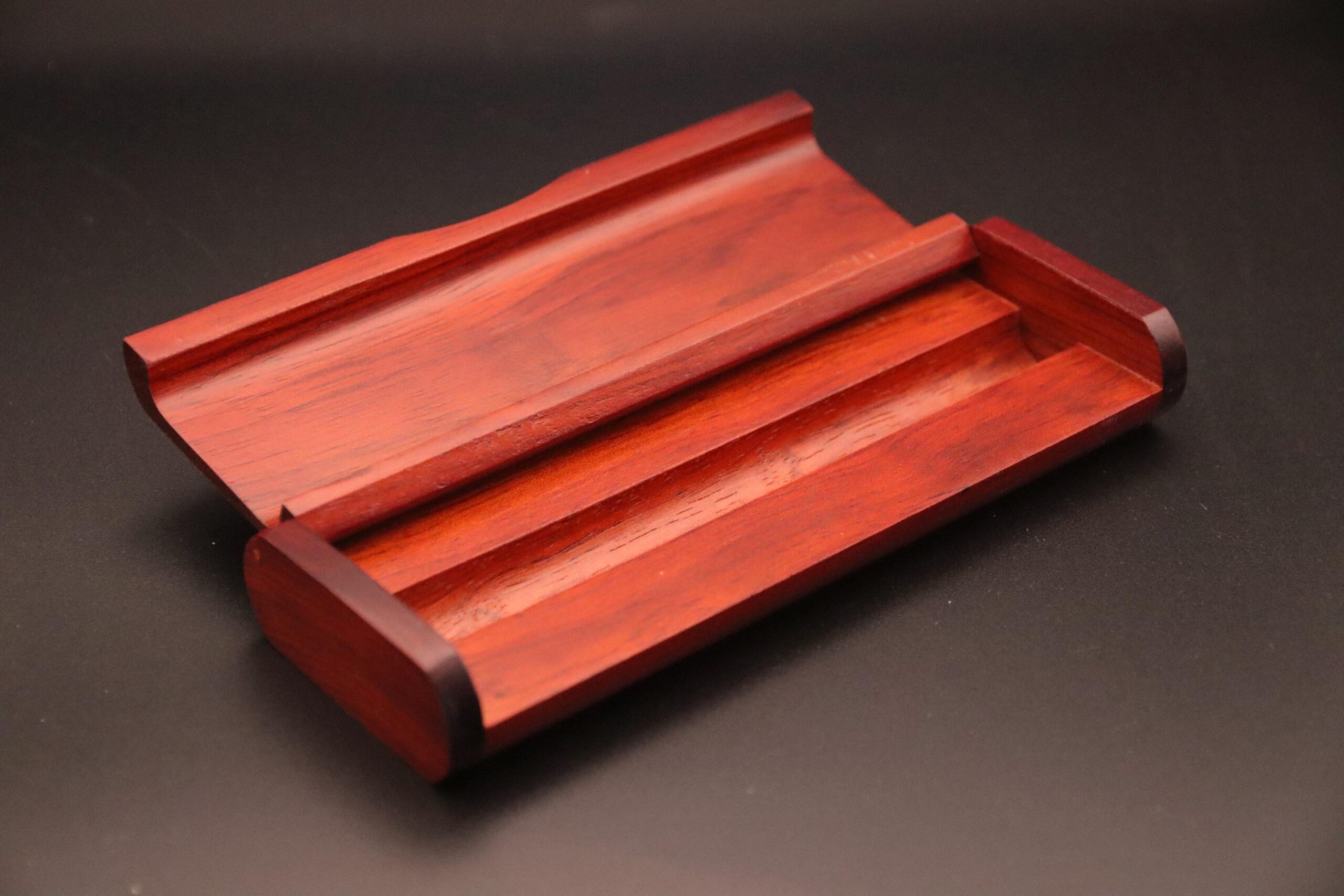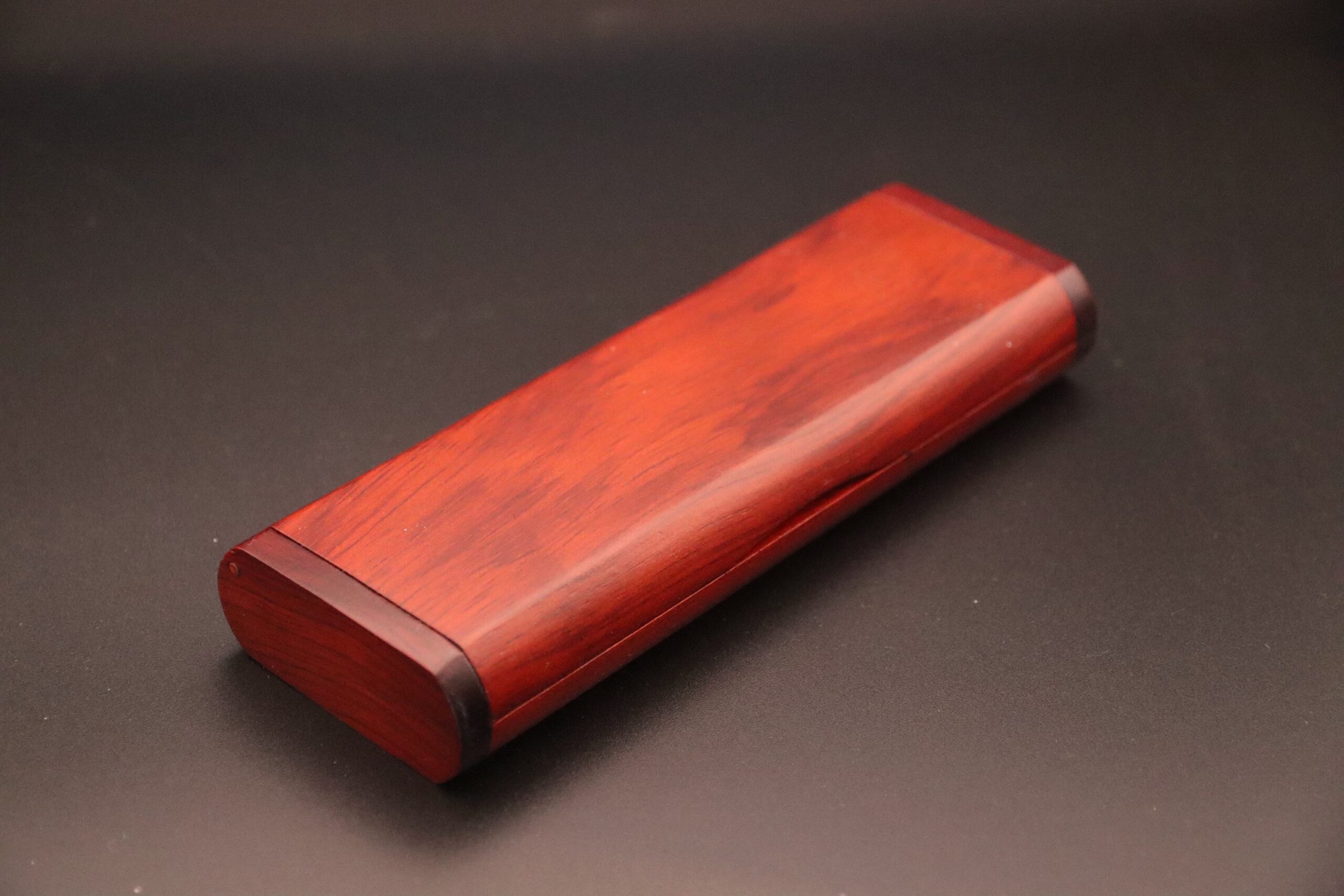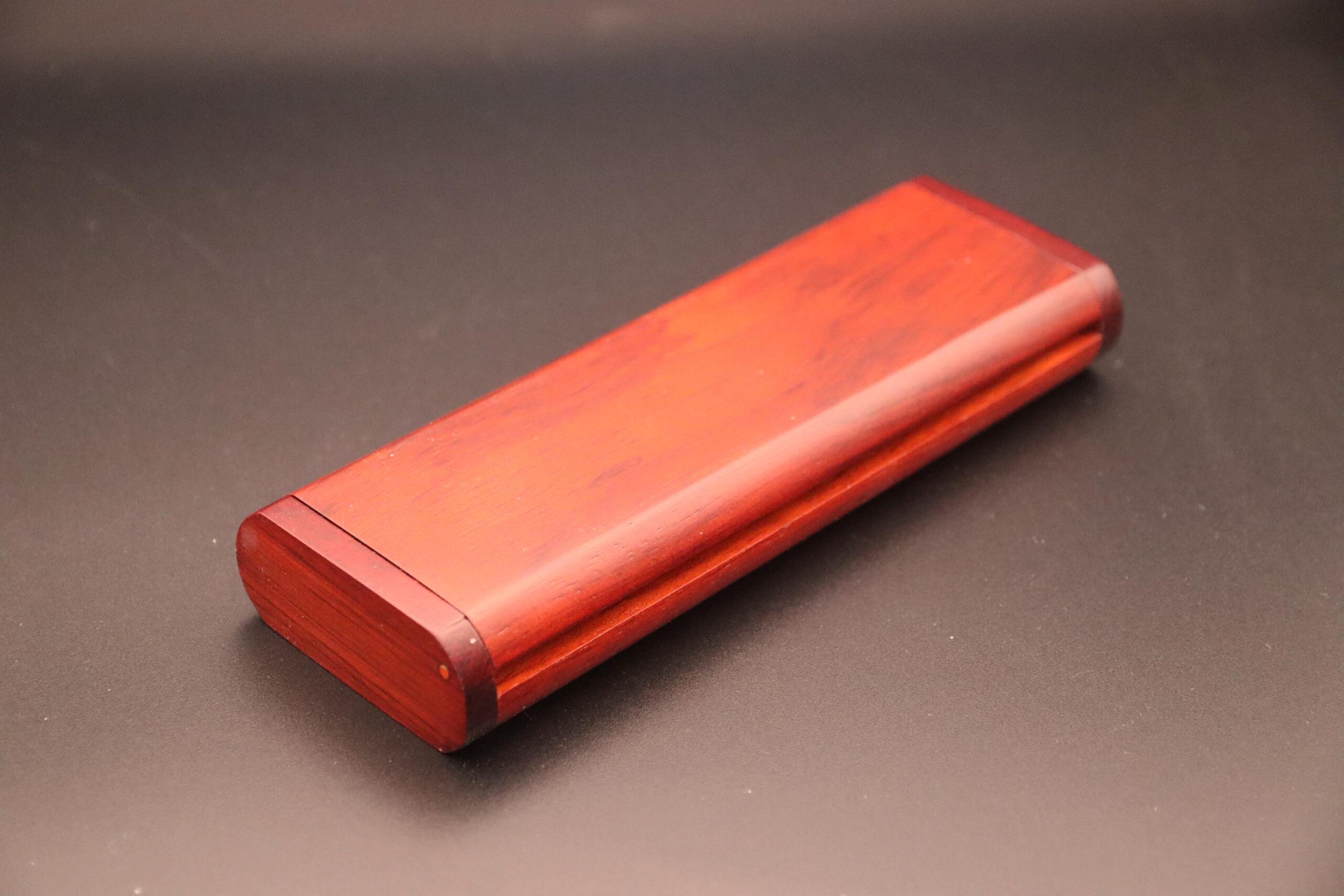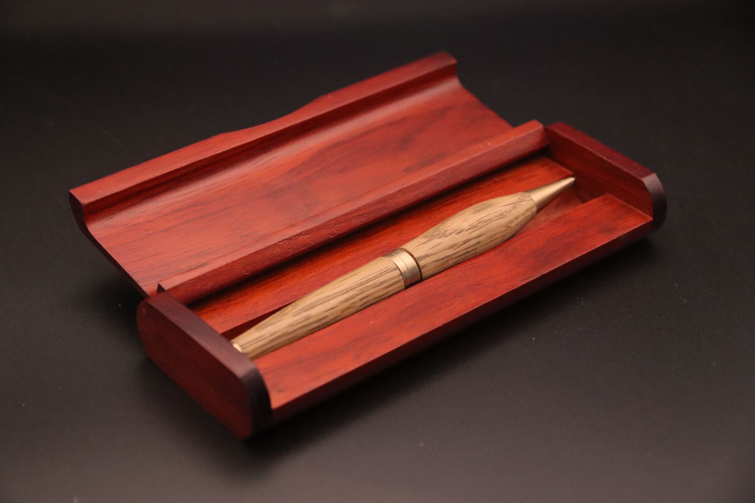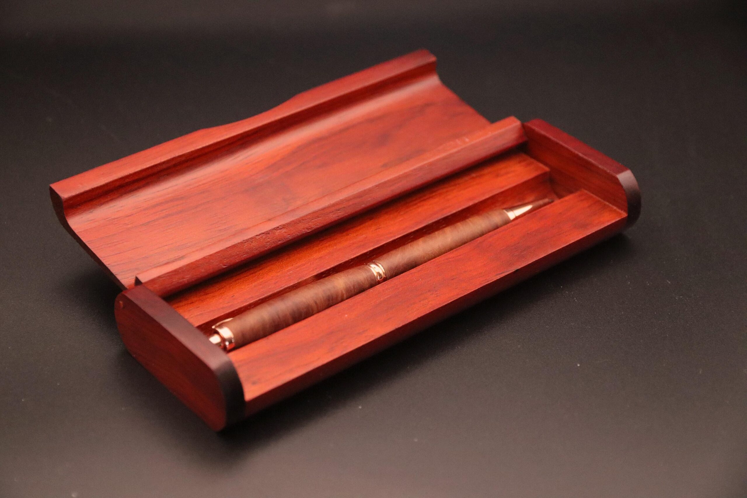 Æske til kuglepenne og stiftblyanter. Æsken er lavet i indfarvet mørkt rødt træ. Den er ikke velegnet til store og tykke penne som fyldepenne og rollerballs, da låget så ikke kan lukke helt.