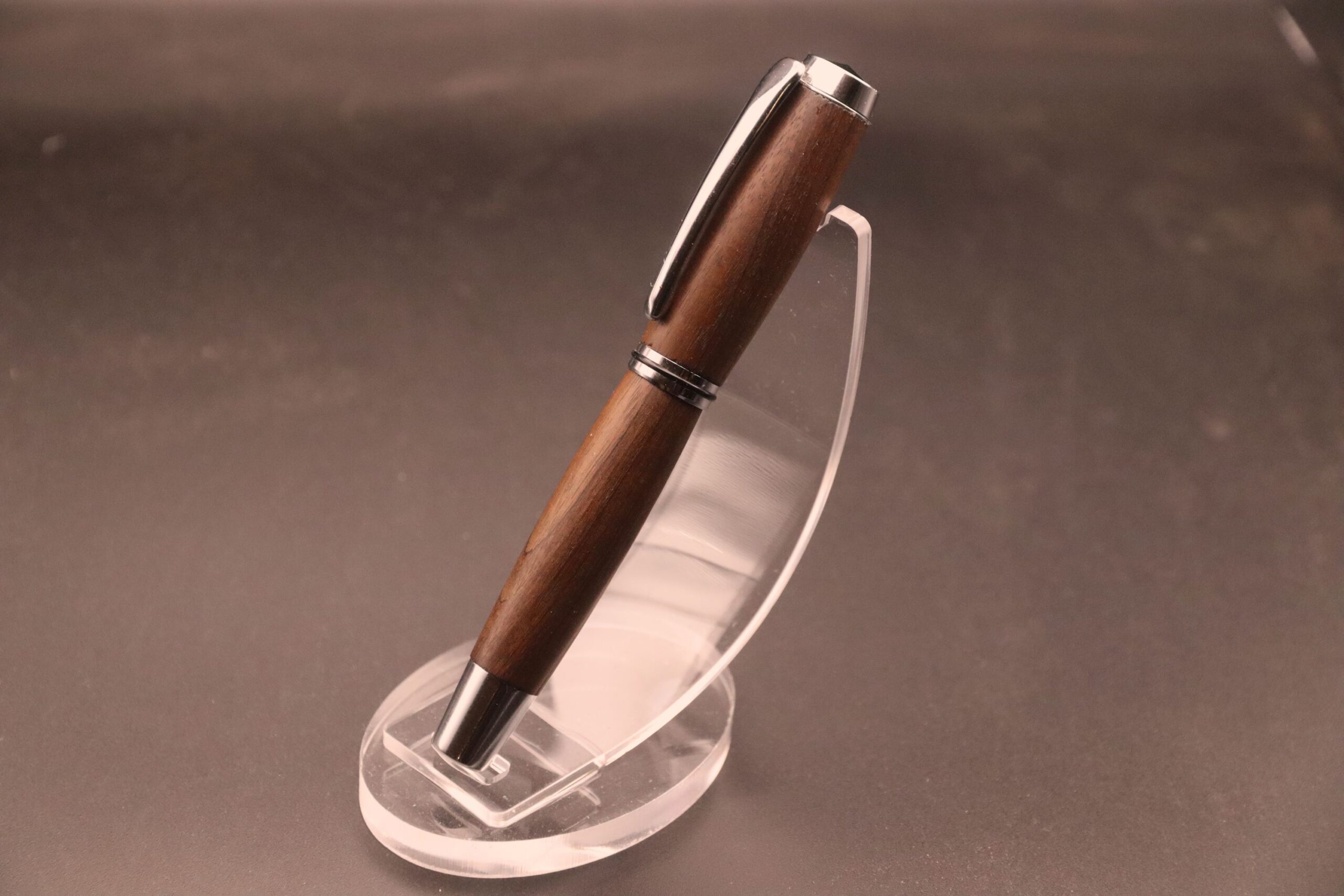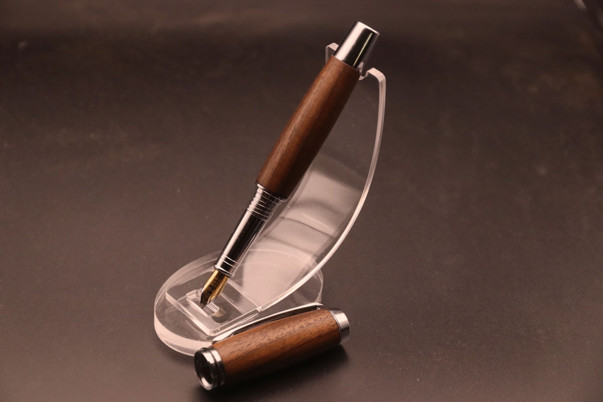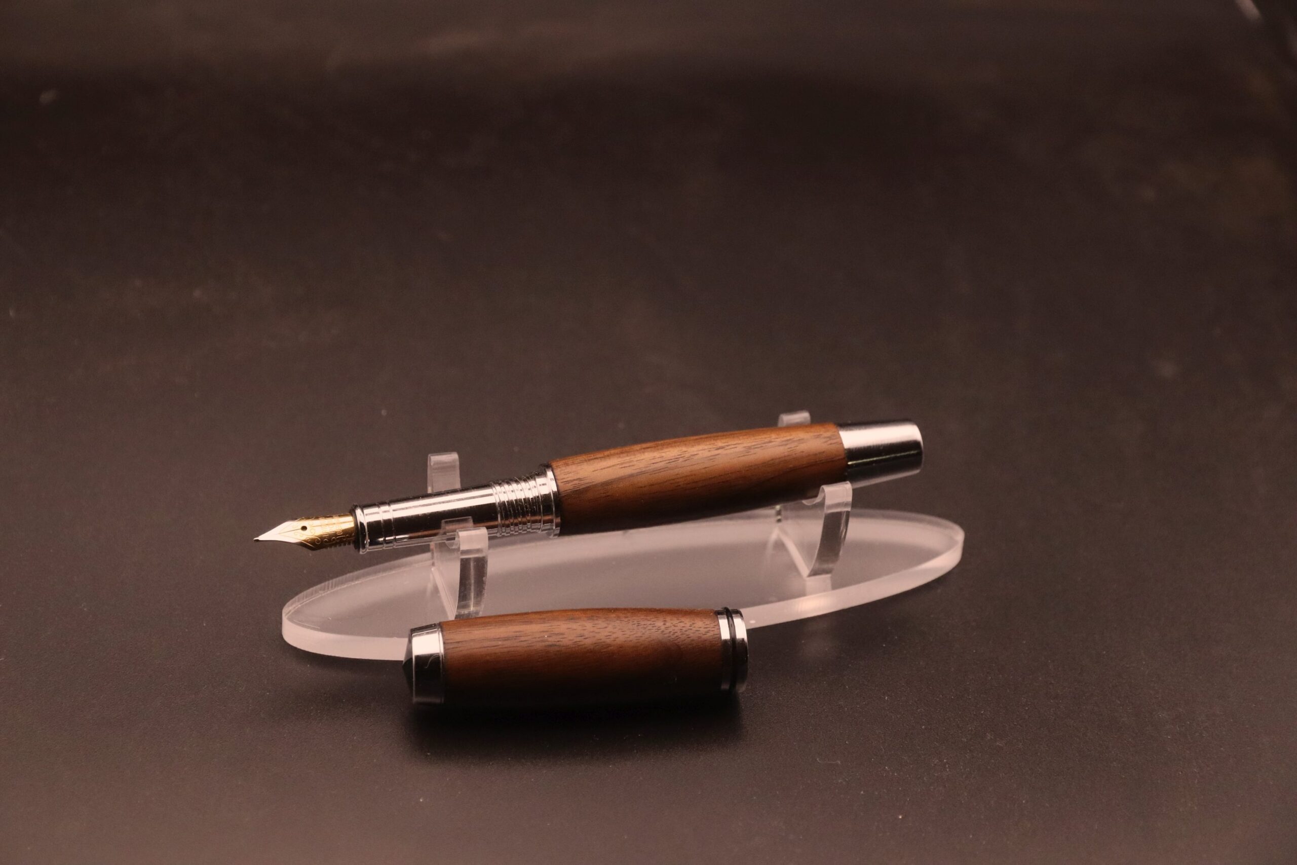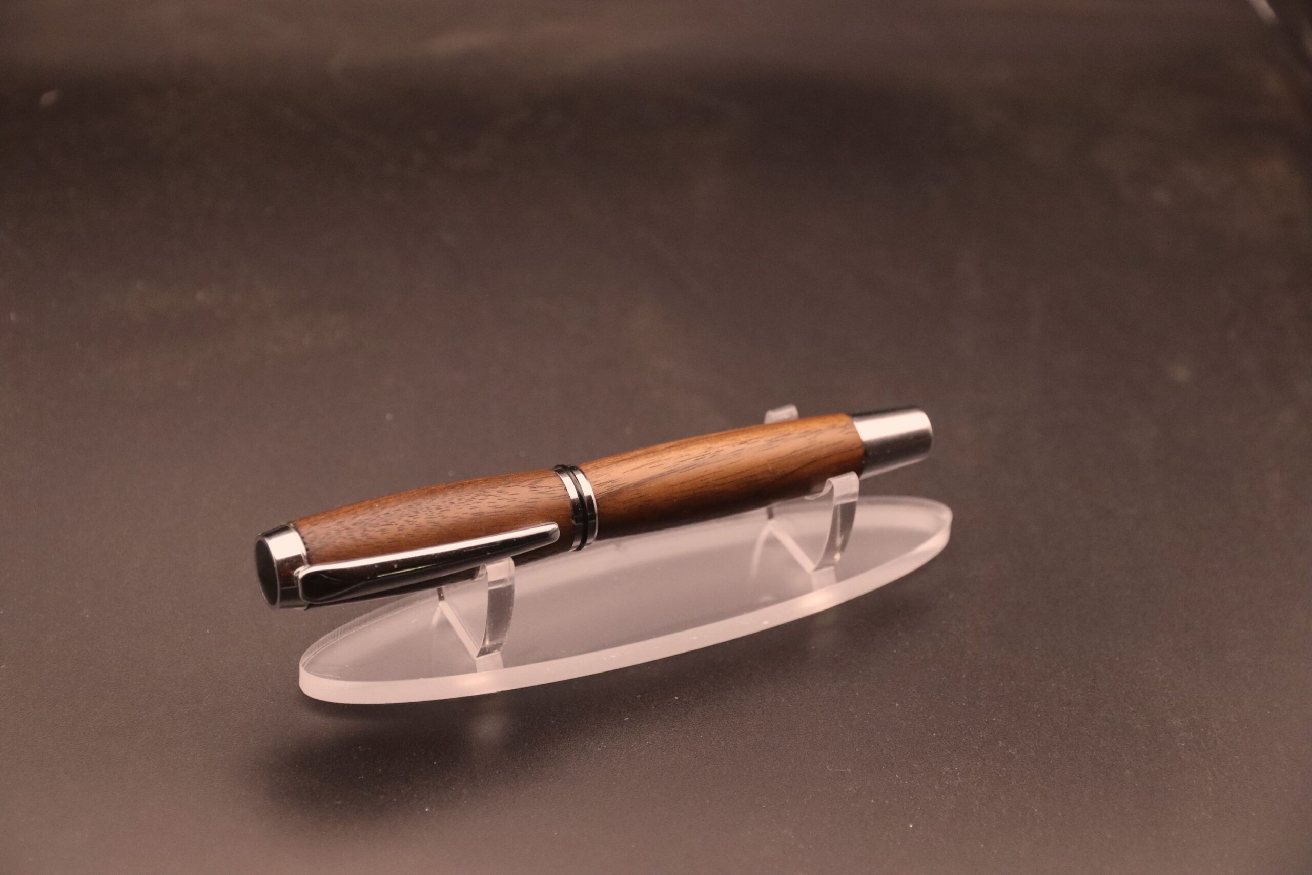 Fyldepen i amerikansk valnød og rhodium. Dette er en meget lækker lille pen i amerikansk valnød med metaldele i rhodium. Den har en medium spids i str. 5.
