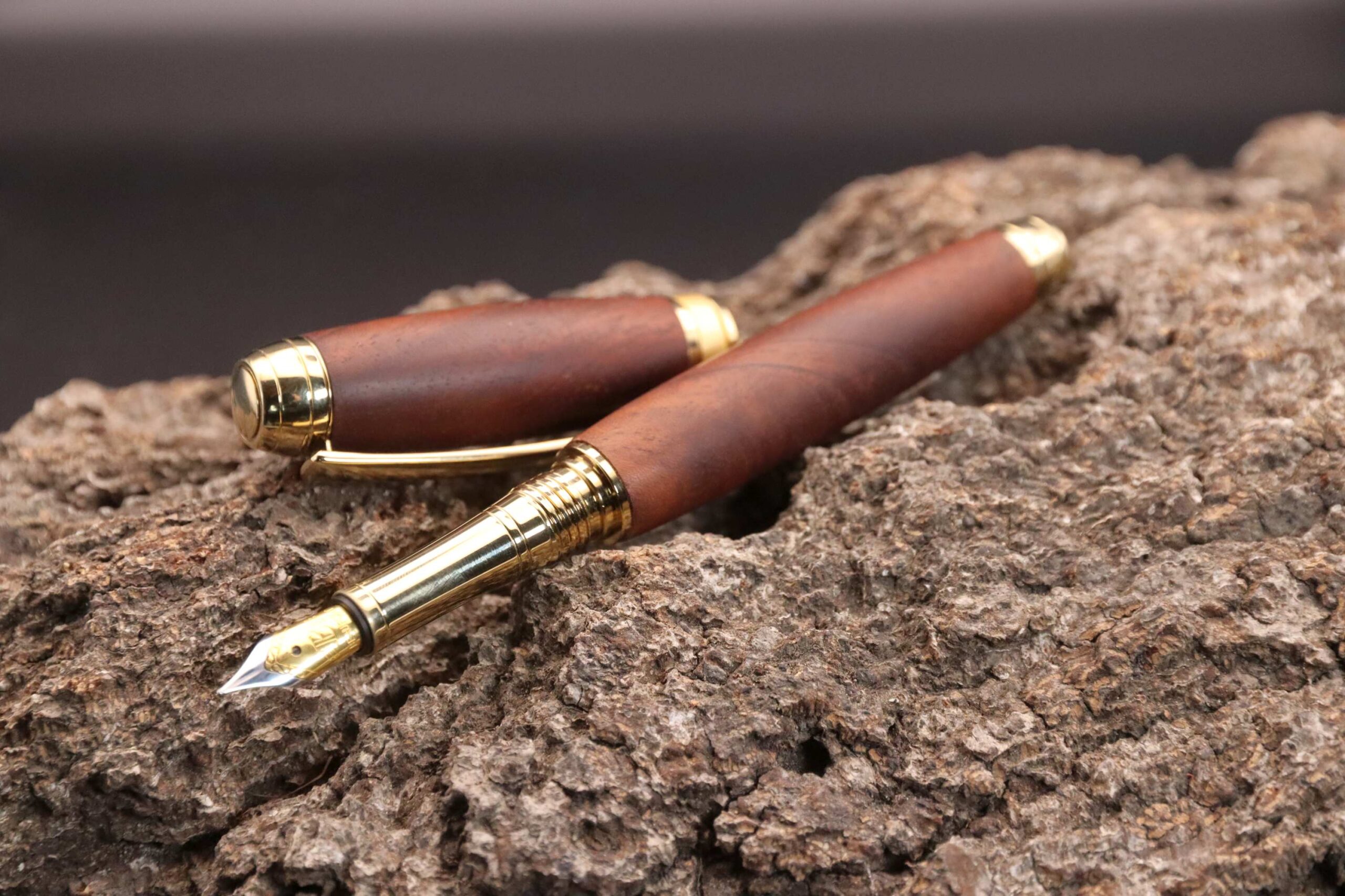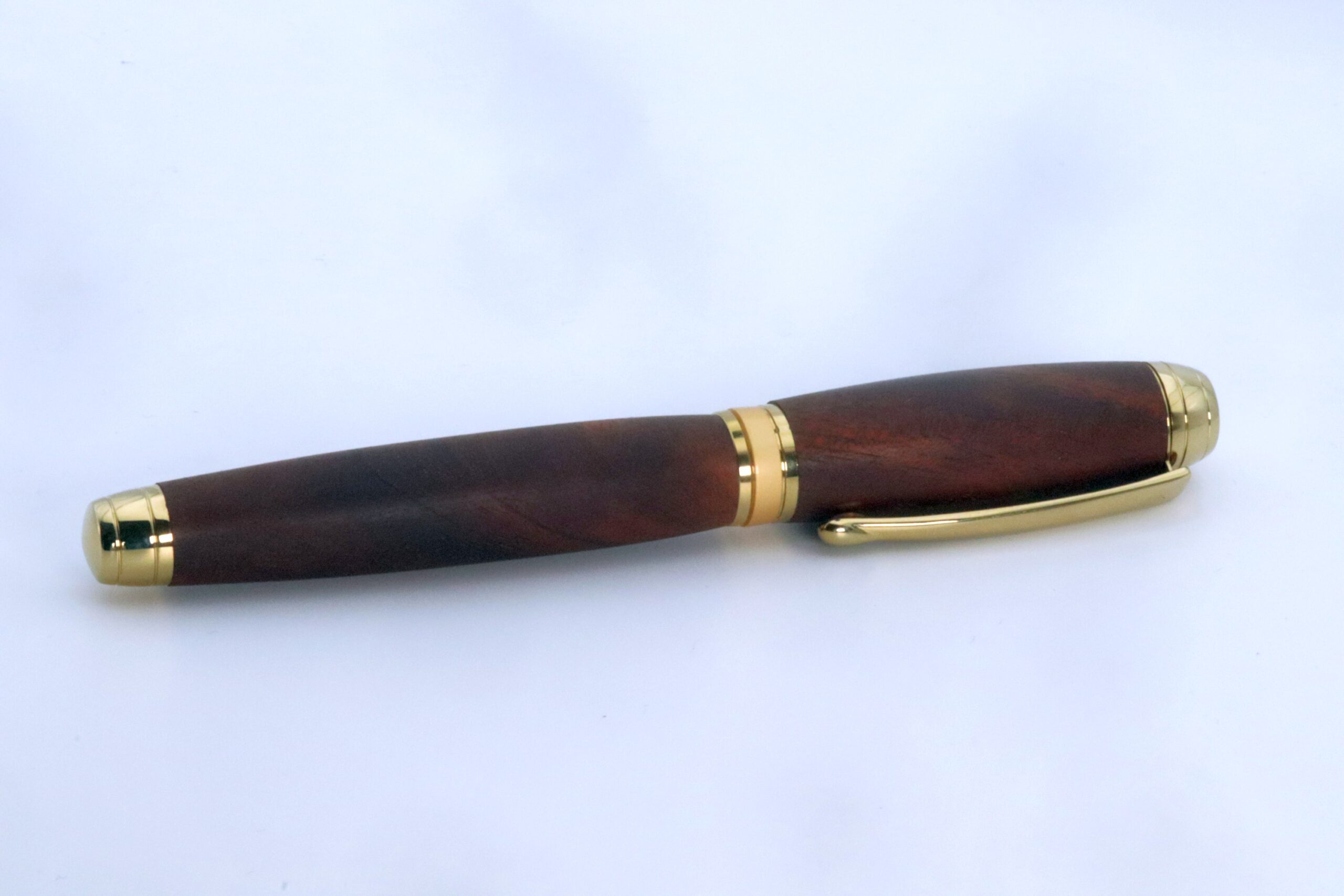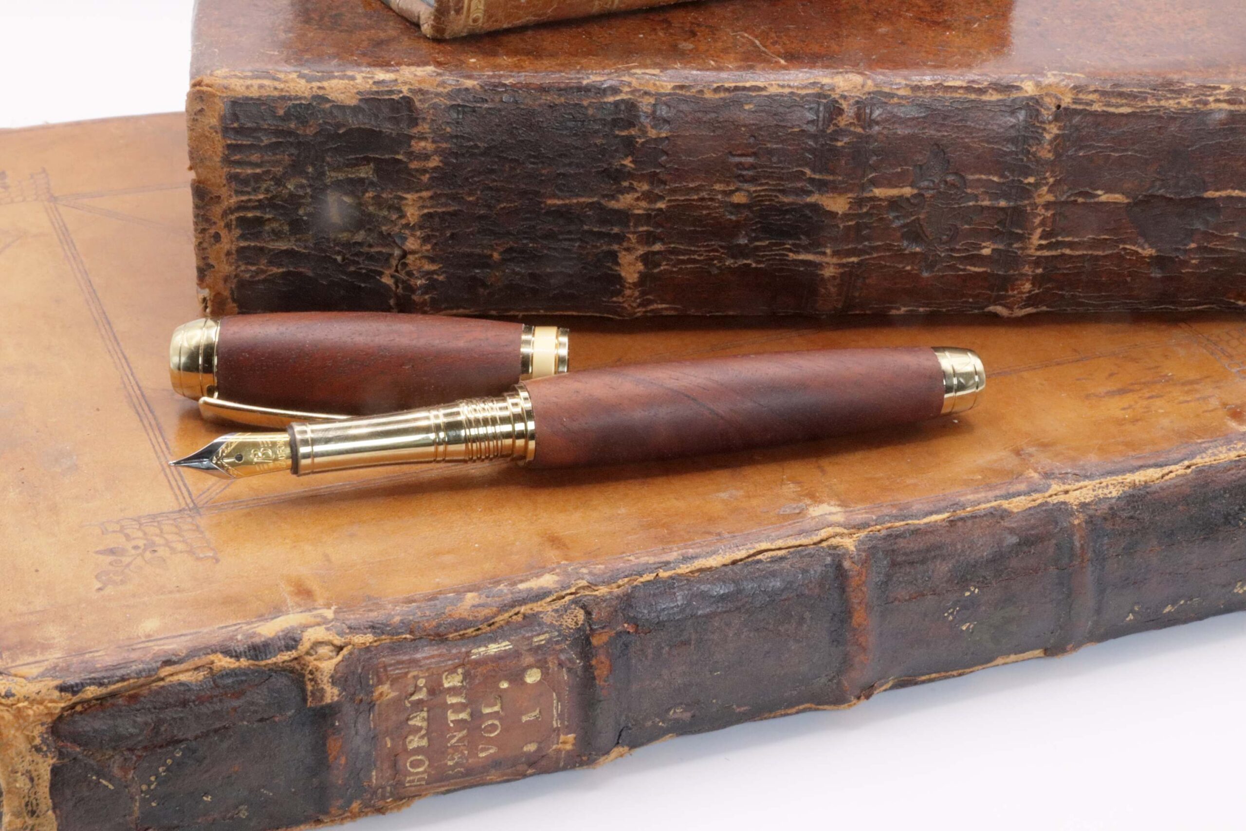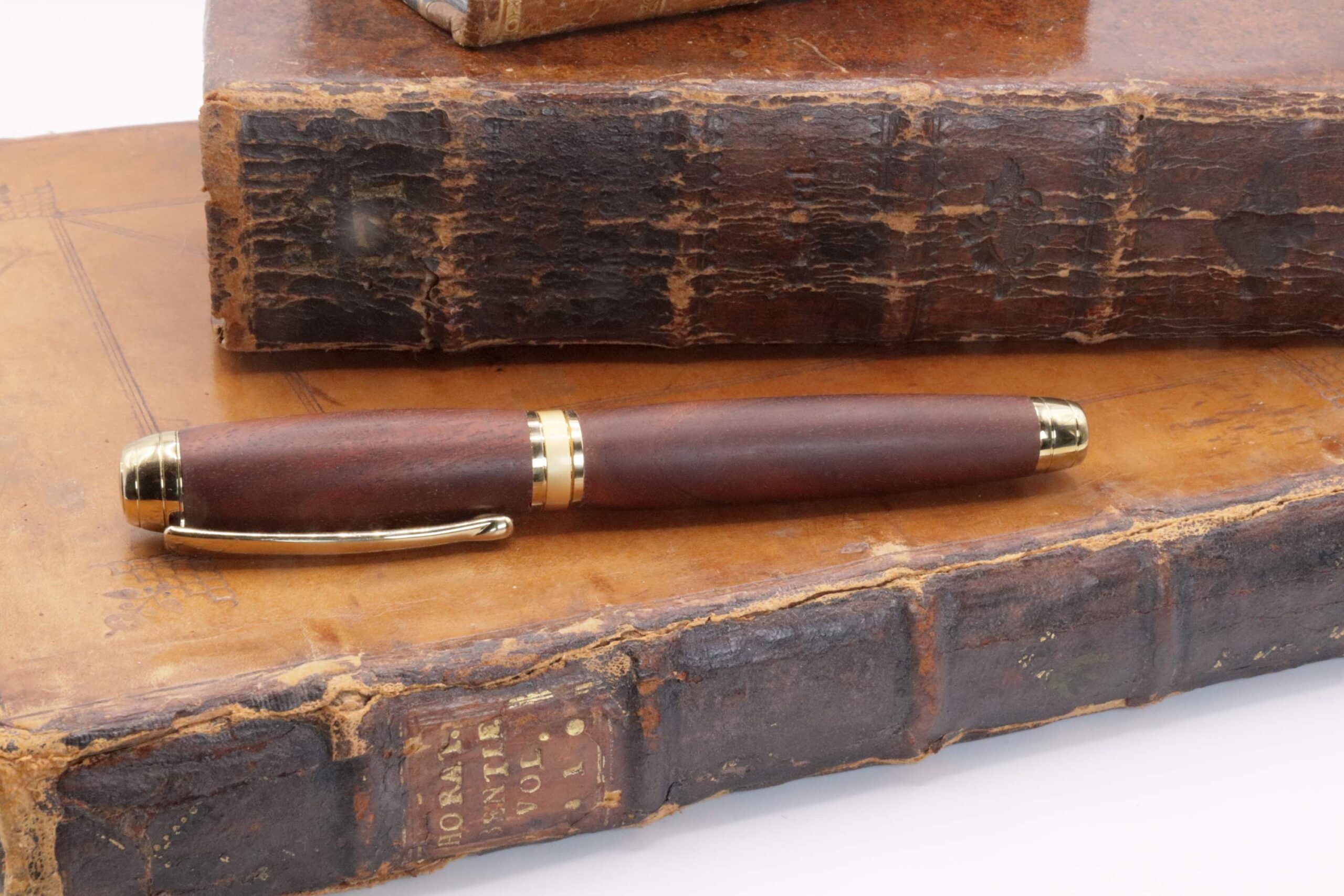 Fyldepen i mørk mahogni med guld-fittings. Medium nib i størrelse 5 BOCK.