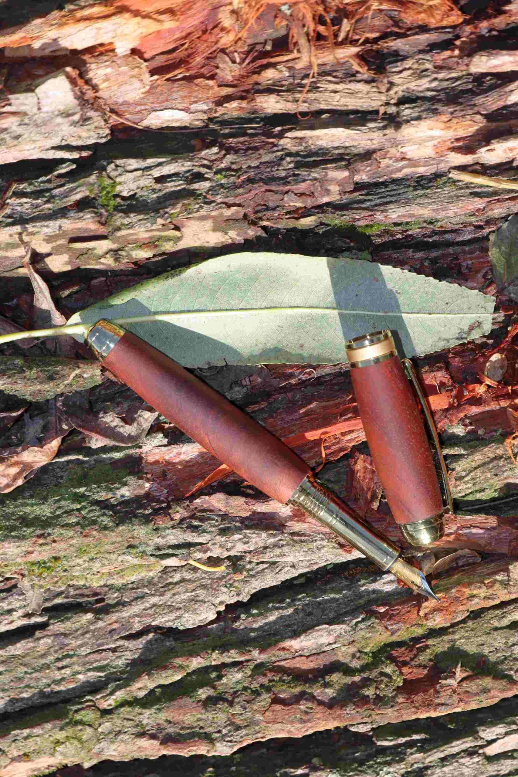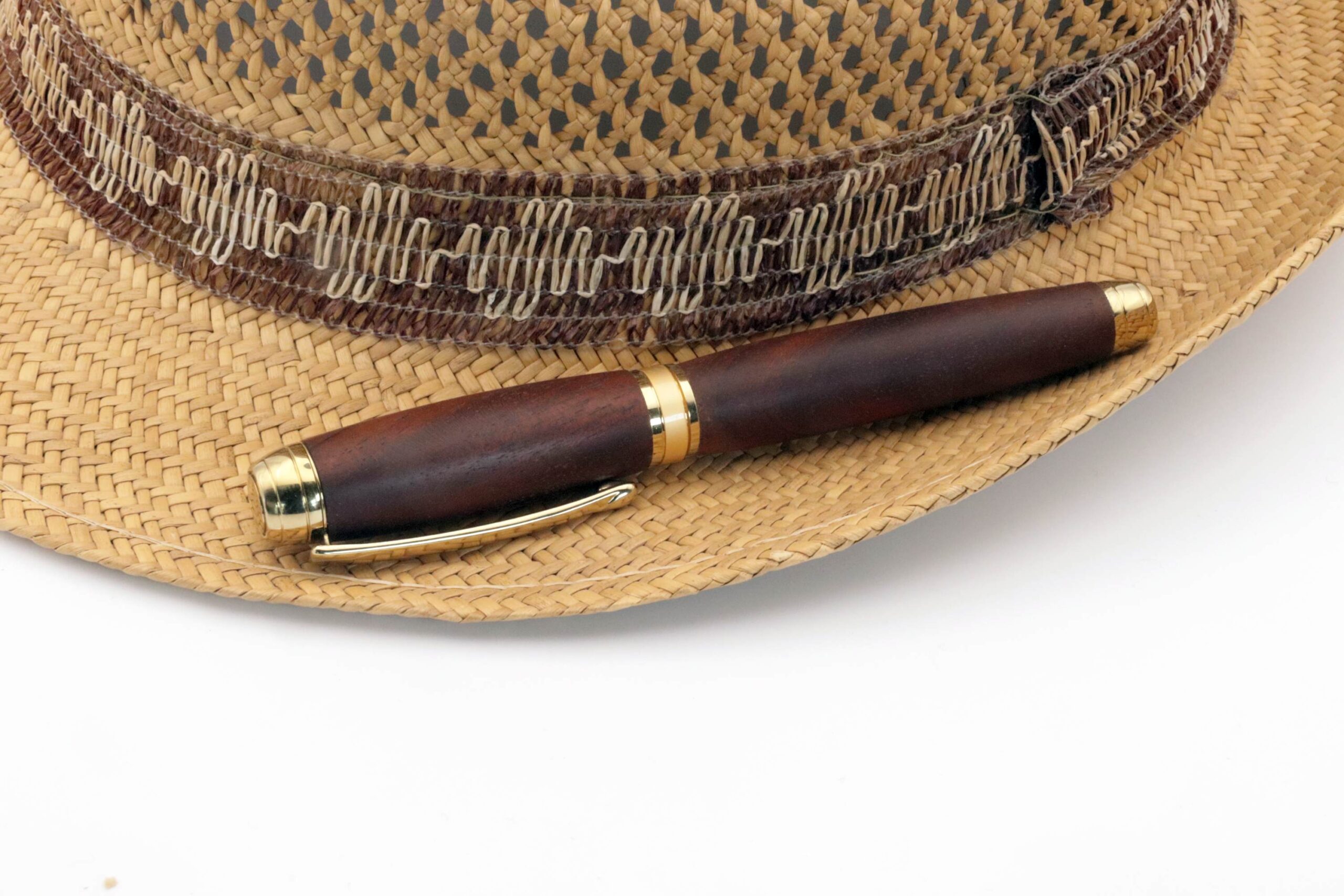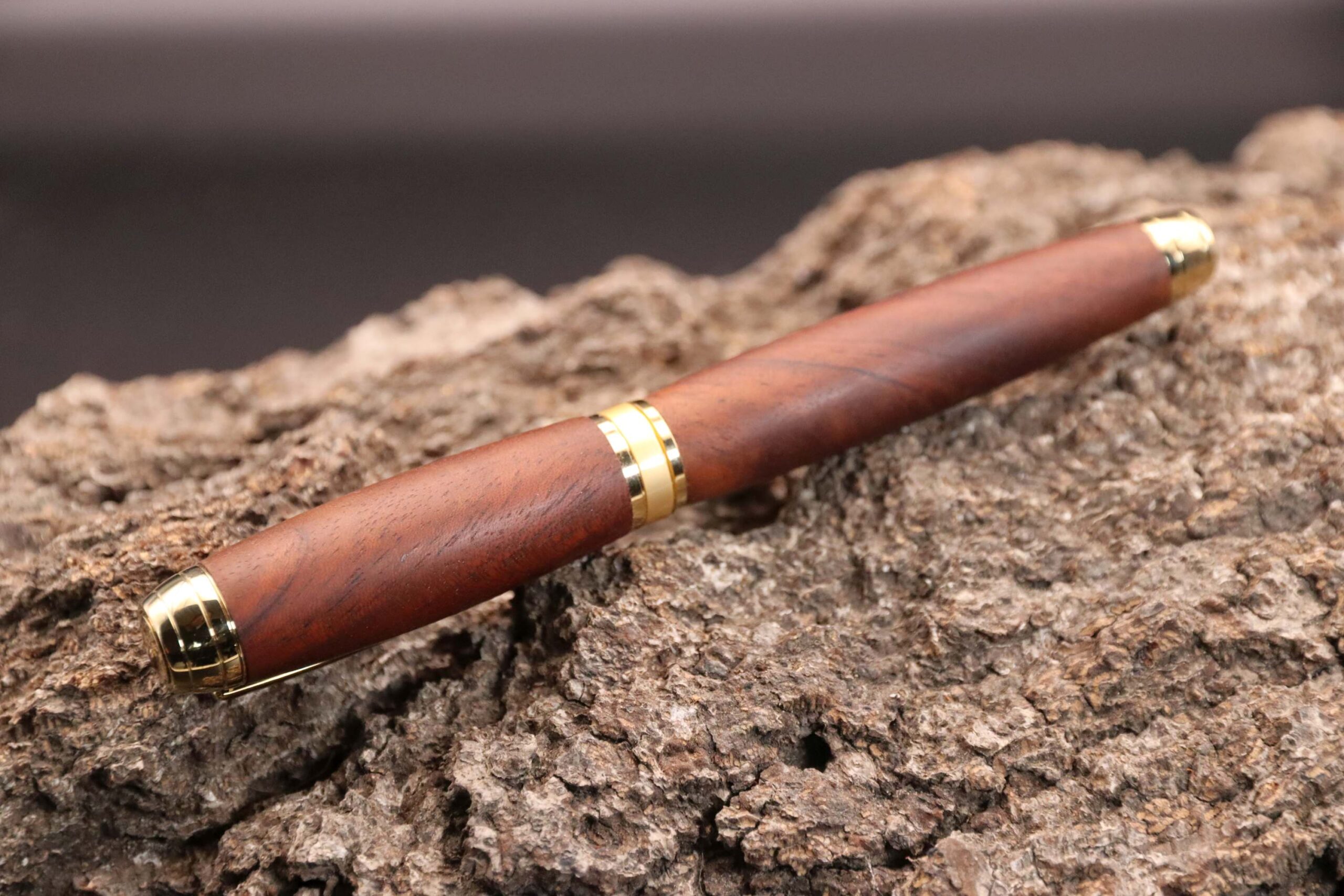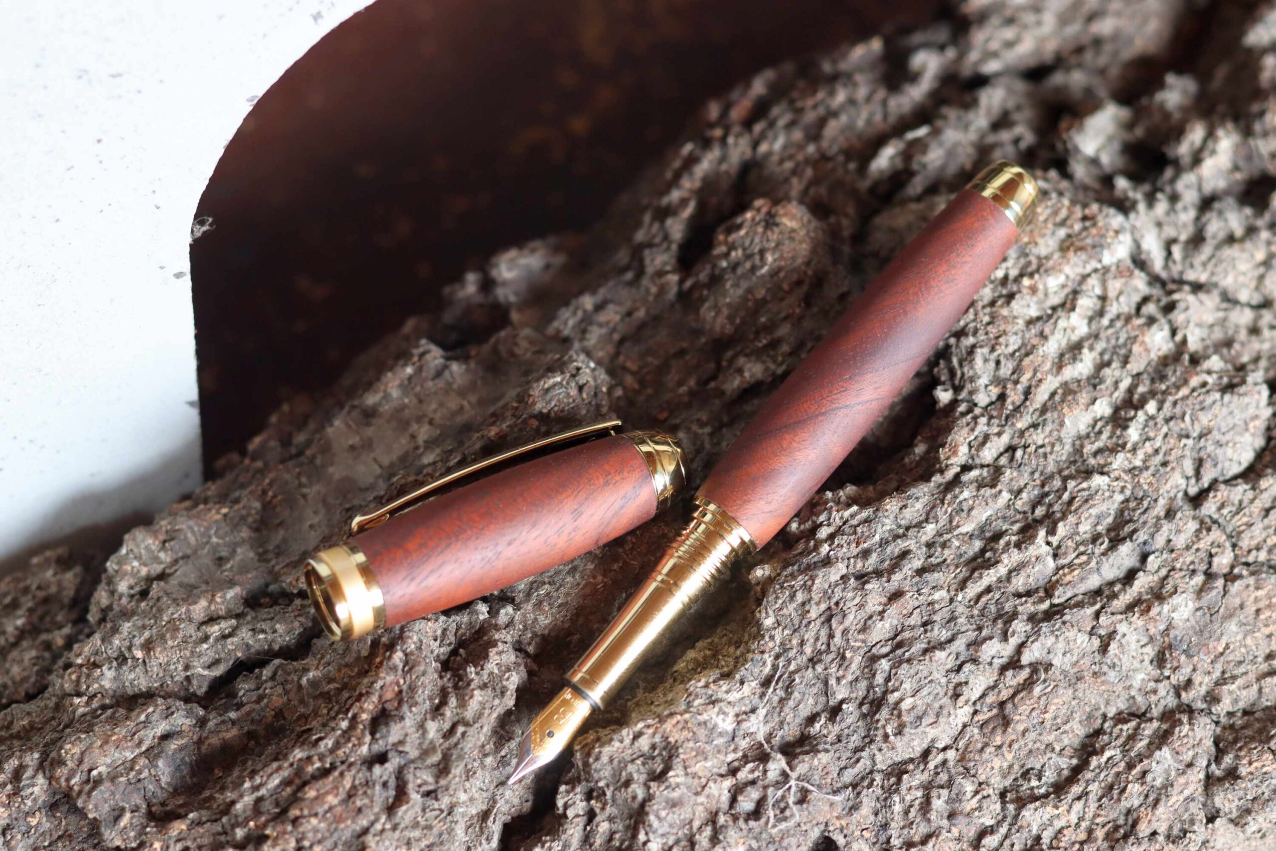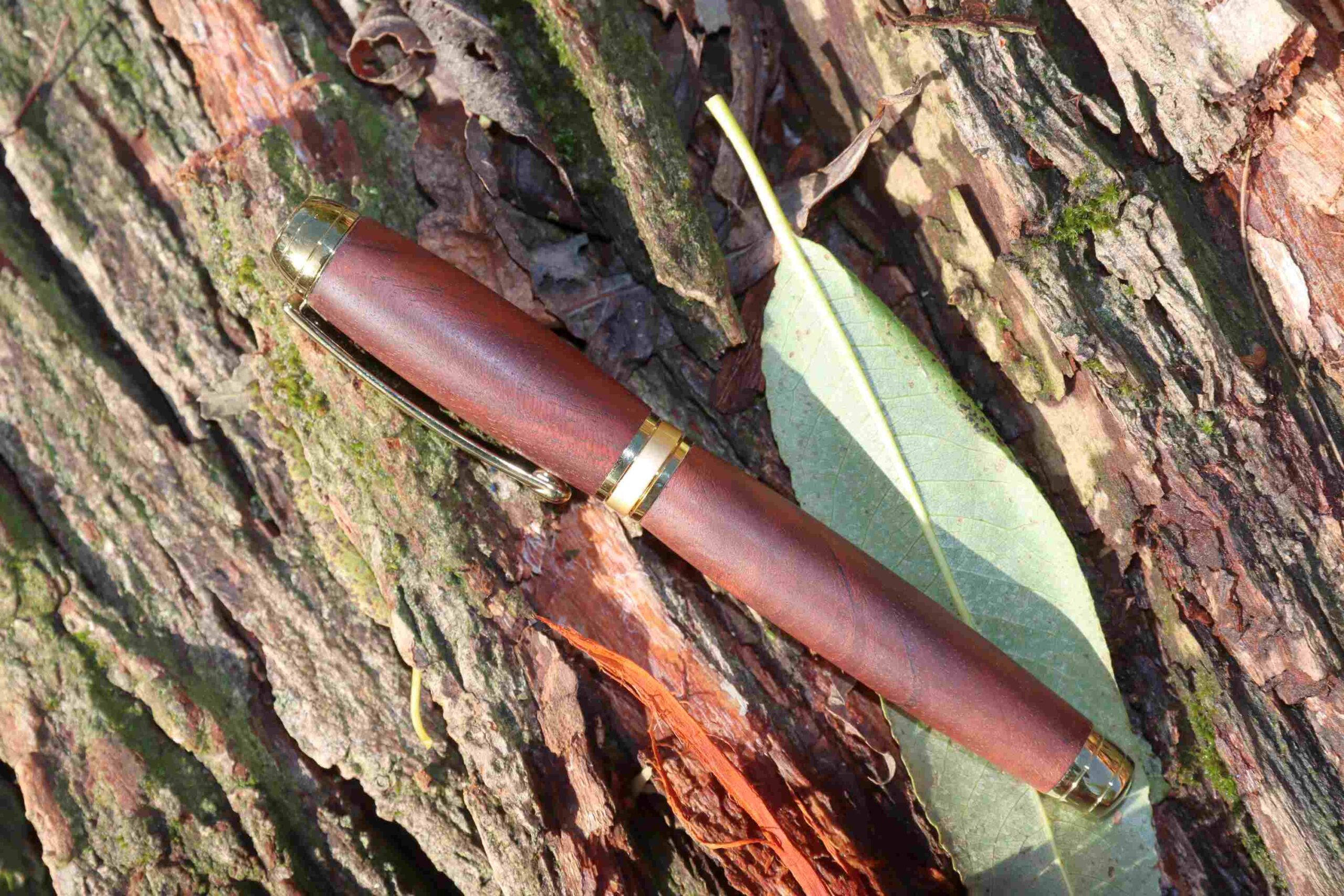 Fyldepen i mørk mahogni med guld-fittings. Medium nib i størrelse 5 BOCK.