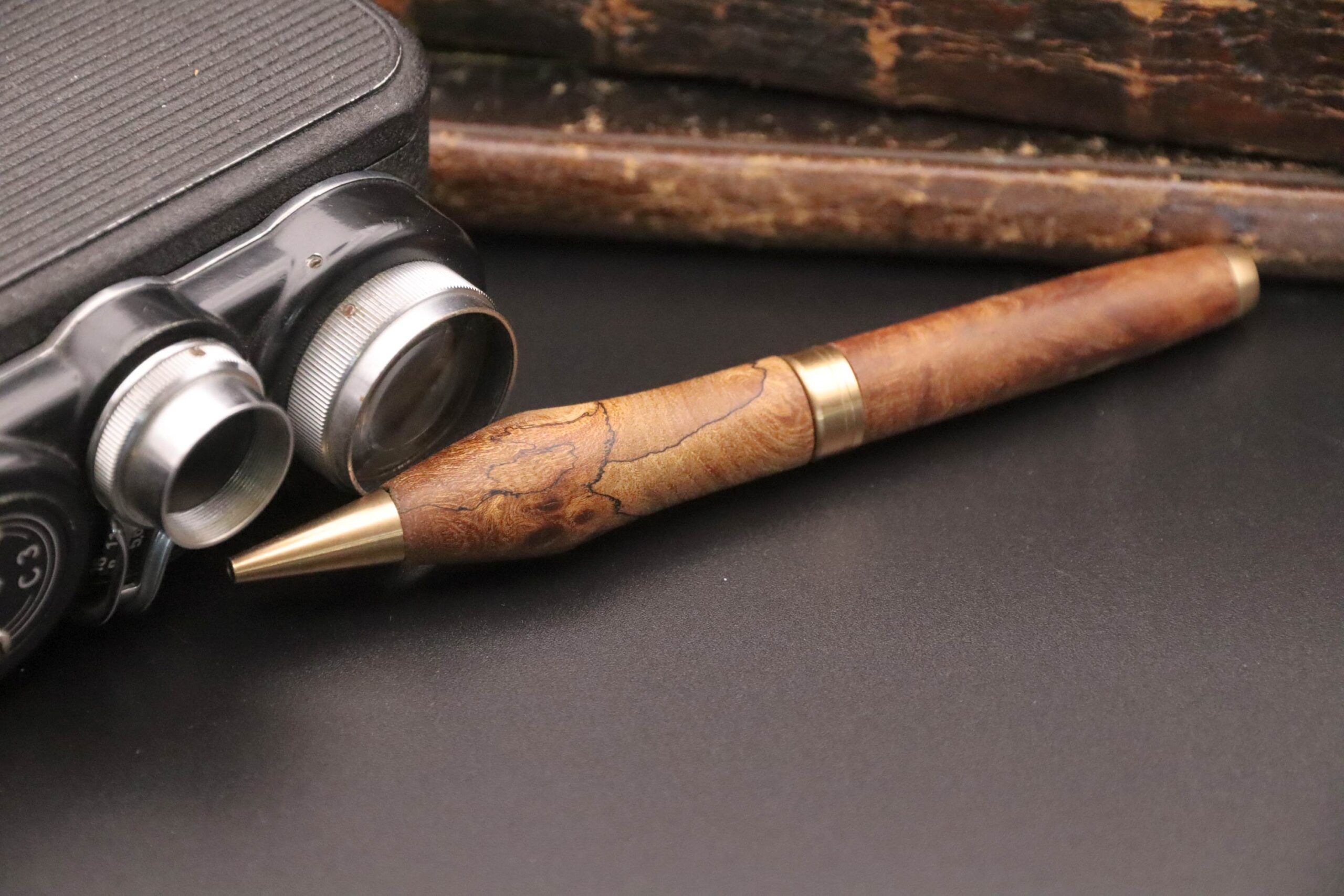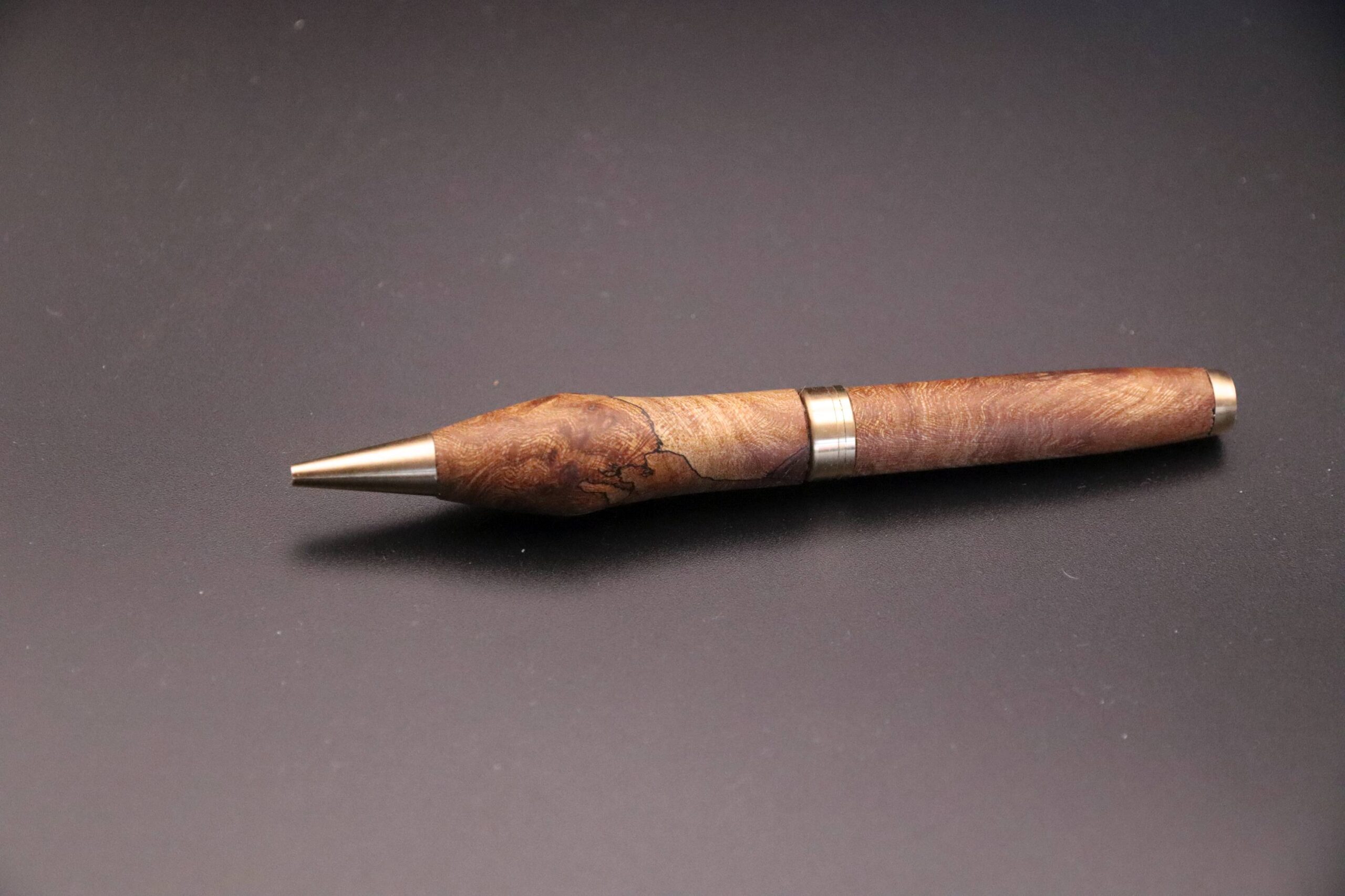 Kuglepen i elmeknude og bronze. Elmeknuden er noget af det sidste jeg har fra en gård på Sydsjælland, som blev ramt af elmesygen. Gårdkonen græd da træerne blev fældet. Træmanden tog knuderne med. Jeg købte et par. Den her er anløben, hvilket betyder at der er små sorte linjer i. Bronzedelene fik jeg lavet til et projekt i 2016.