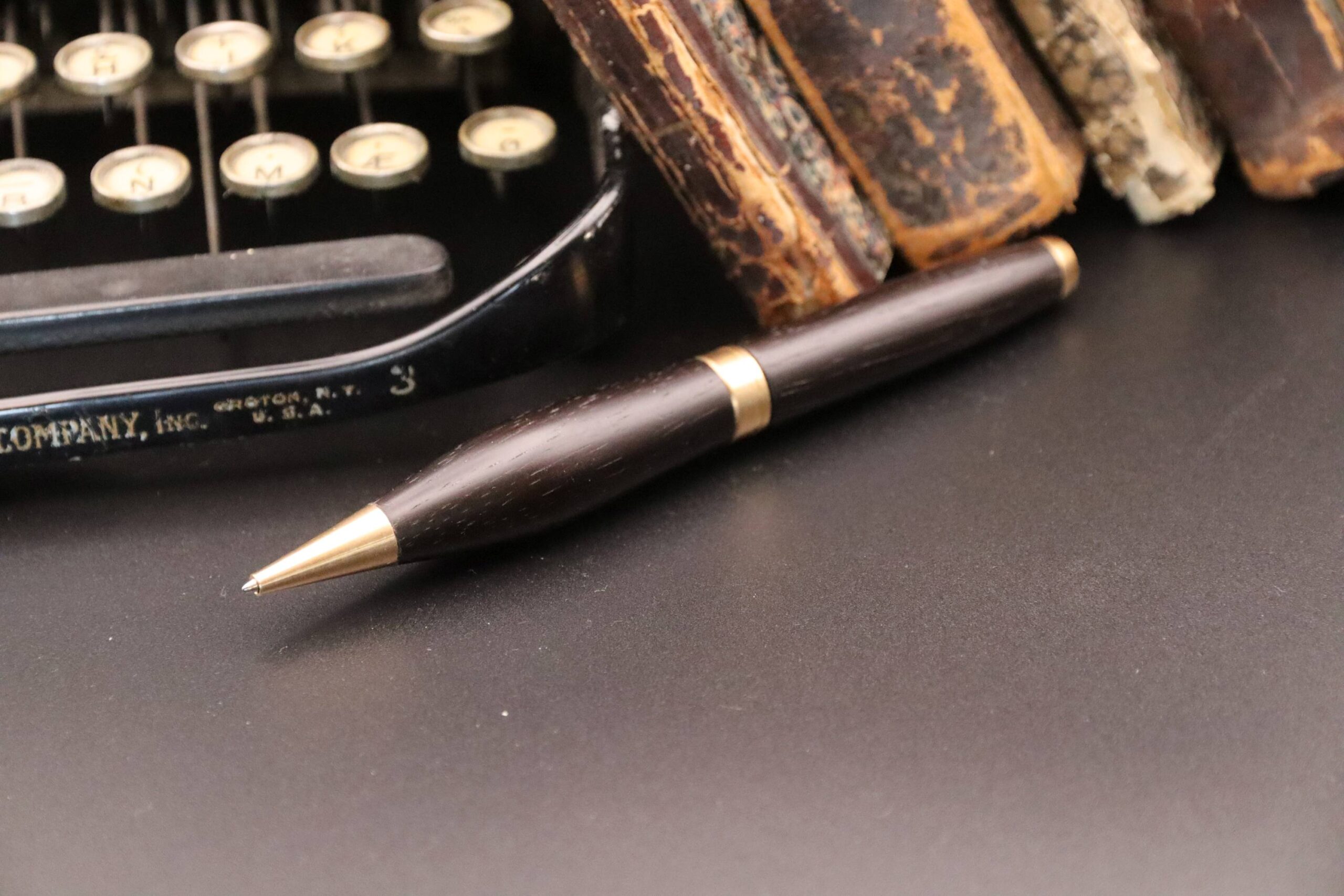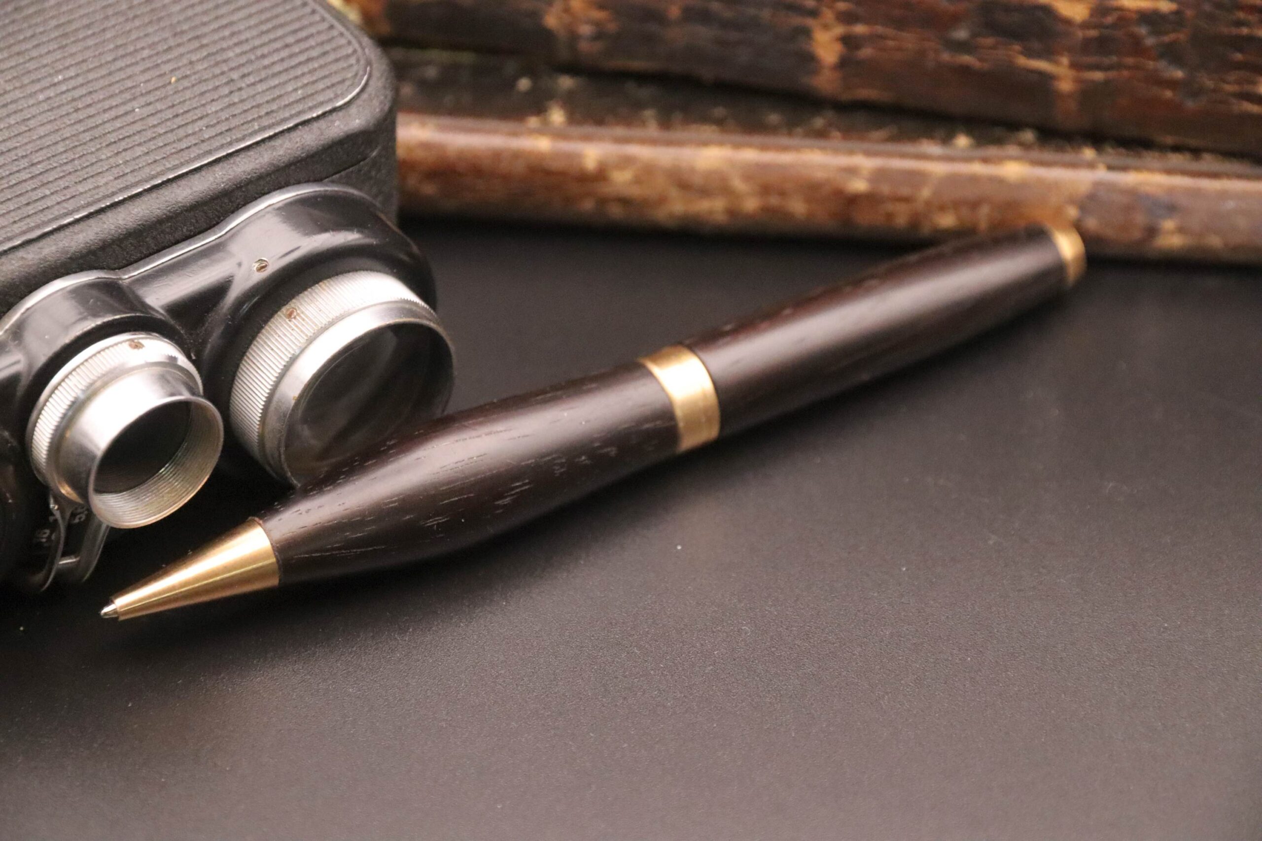 Kuglepen i sort Palisander og Bronze. Jeg har fået en pose med nogle gamle bordben og lister i palisander, som er blevet til penne. Det er meget smukt og lækkert. Bronzedelene er fra et kickstarterprojekt for ti år siden, som gik forbløffende godt.