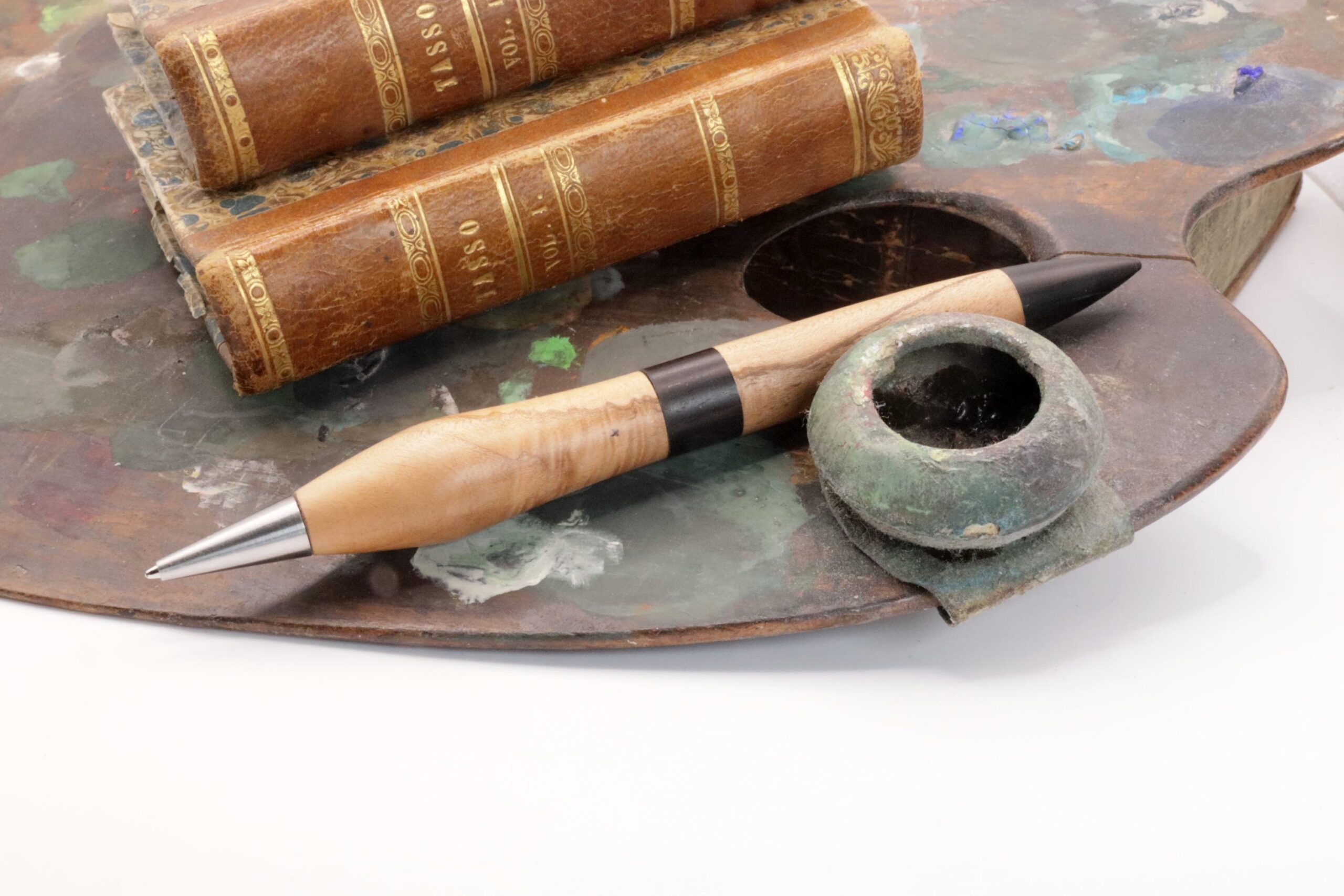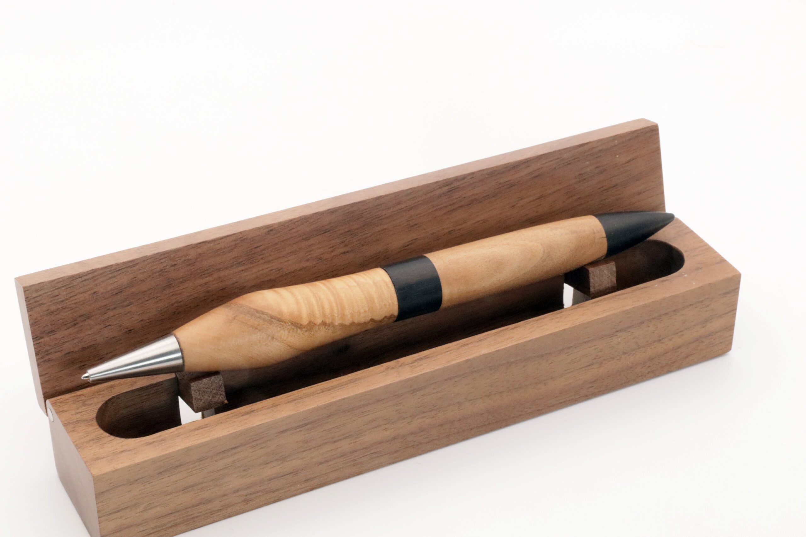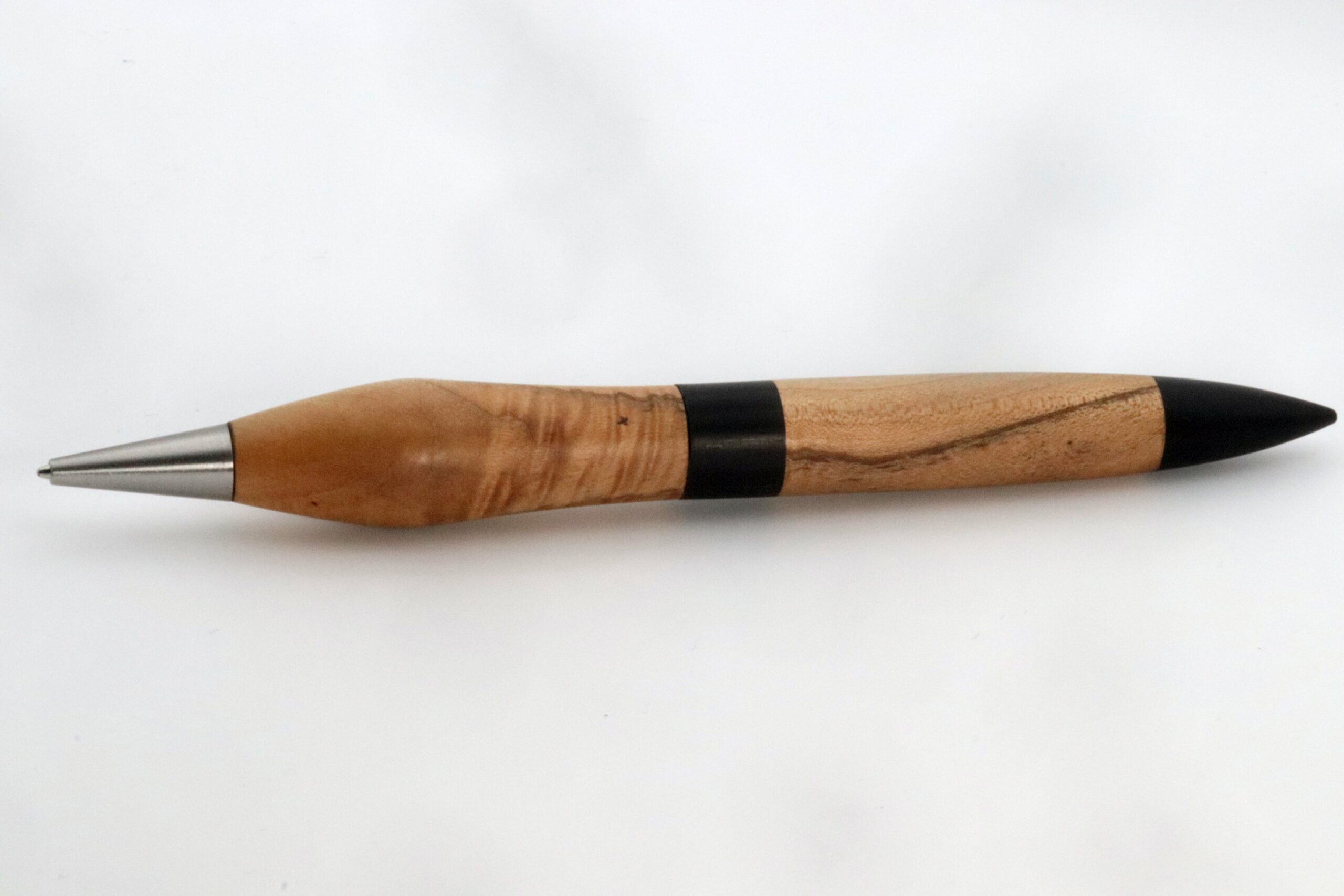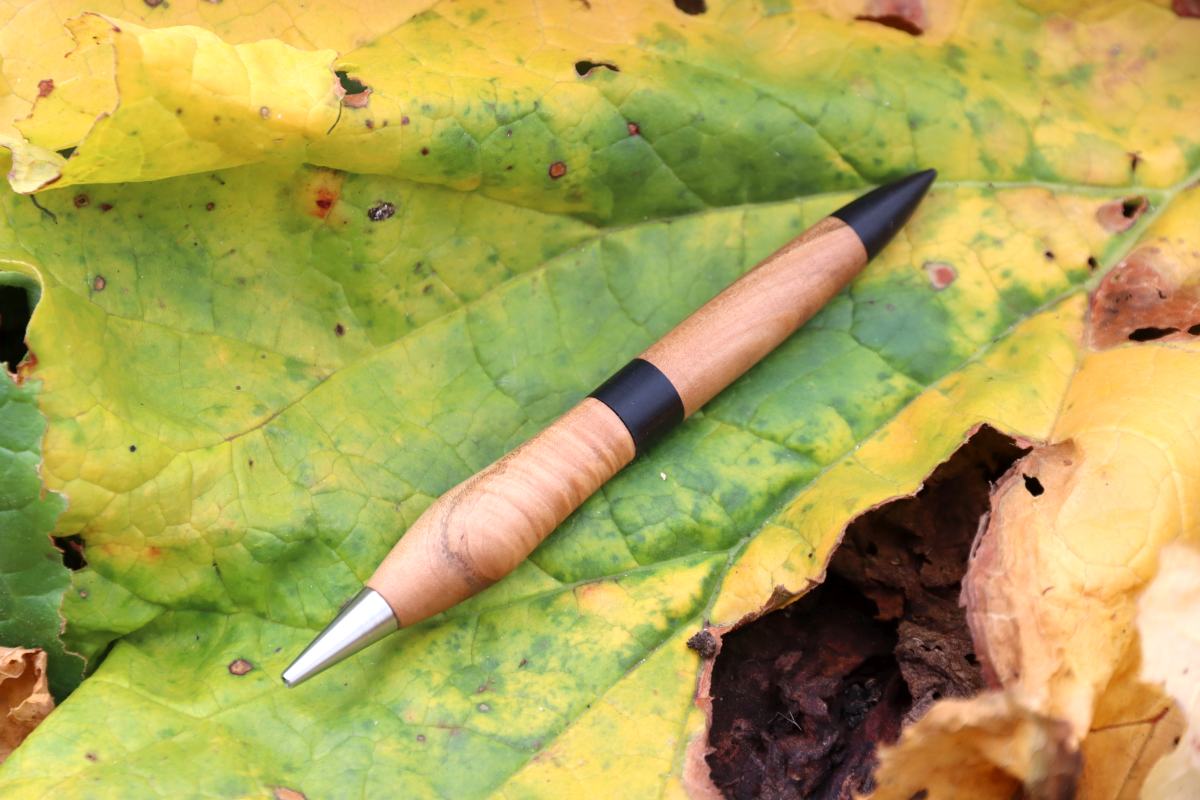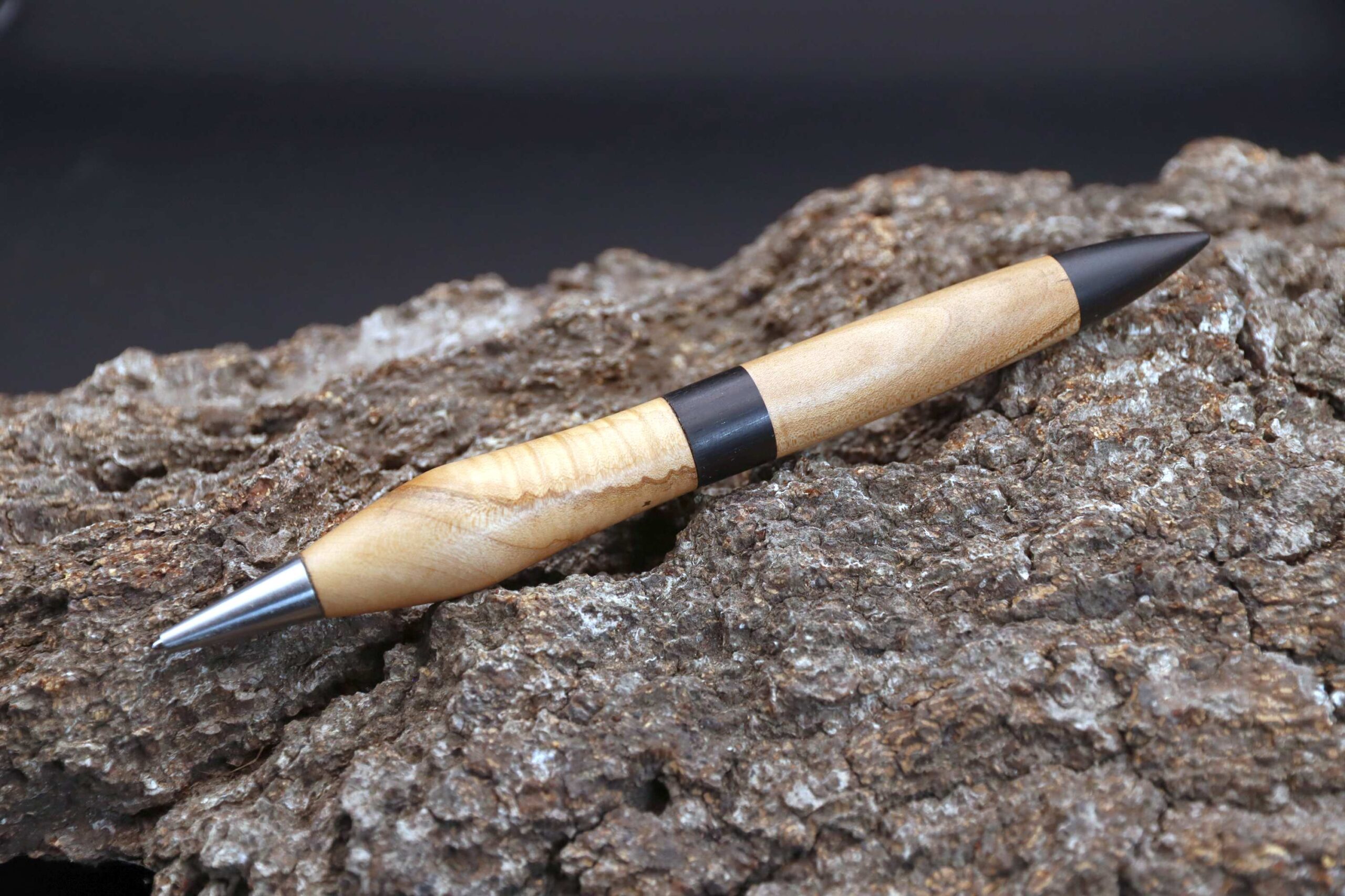 Kuglepen i vimmerask og ibenholt. Når vinden blæser og træets grene gynger op og ned, får grenenes fæste – der hvor tvejningen er – strækmærker, ligesom underhuden på kvinder, når de er gravide og maven vokser hurtigt. Det kan give et fantastisk lysspil nede i træet, som er en ekstra dejlig ting at nyde, ved det mærkelige og ‘kassérbare’ træ, som jeg som pennemager elsker at bruge. Denne pen er drejet i noget træ, som kommer fra Boserup skov nær Roskilde. De sorte dele er ibenholt og pennespidsen er i rustfrit stål.