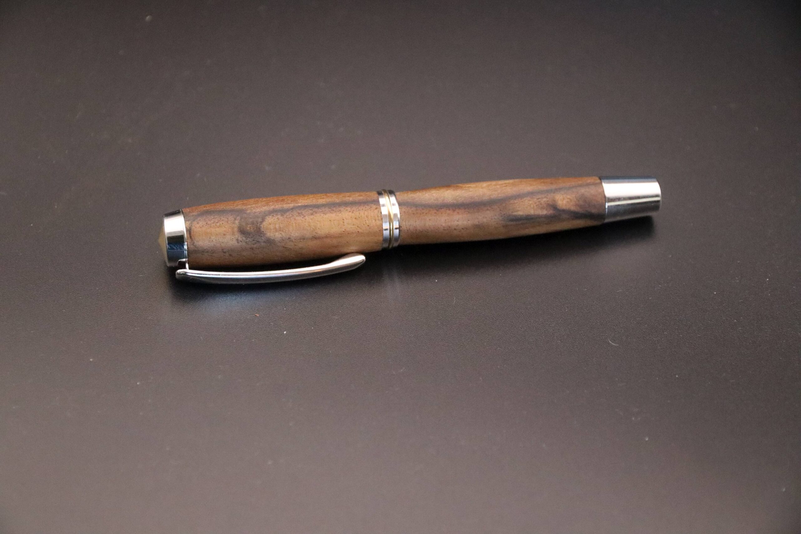 Rollerball i Valnød og Rhodium. Den valnød stod i hovedgaden i Jægerspris. Den var stor og over 100 år gammel. Jeg var på vej hjem fra nattevagt ovre i børnehjemmet, da jeg så min ‘handyman’-bekendte i færd med at tage den ned. Jeg kastede bilen ind i rabatten og gik ud for at ‘slå en sludder af’. Det var nu ikke tid til at fedte rundt, så jeg kom straks til sagen – og kort efter kørte jeg hjem med et par store stykker valnød med en meget tydelig mørk tegning. Den er blevet til mange penne og nu er der næsten ikke noget tilbage.