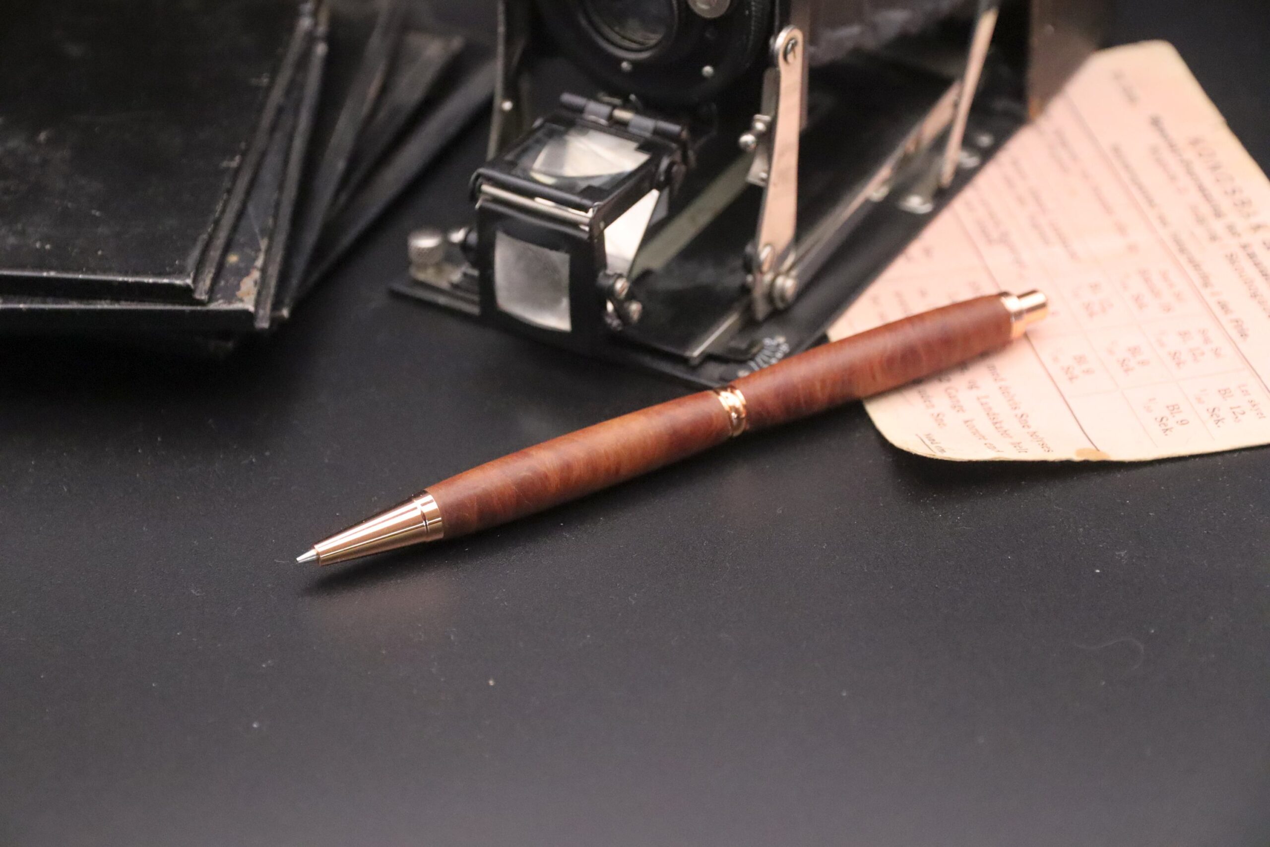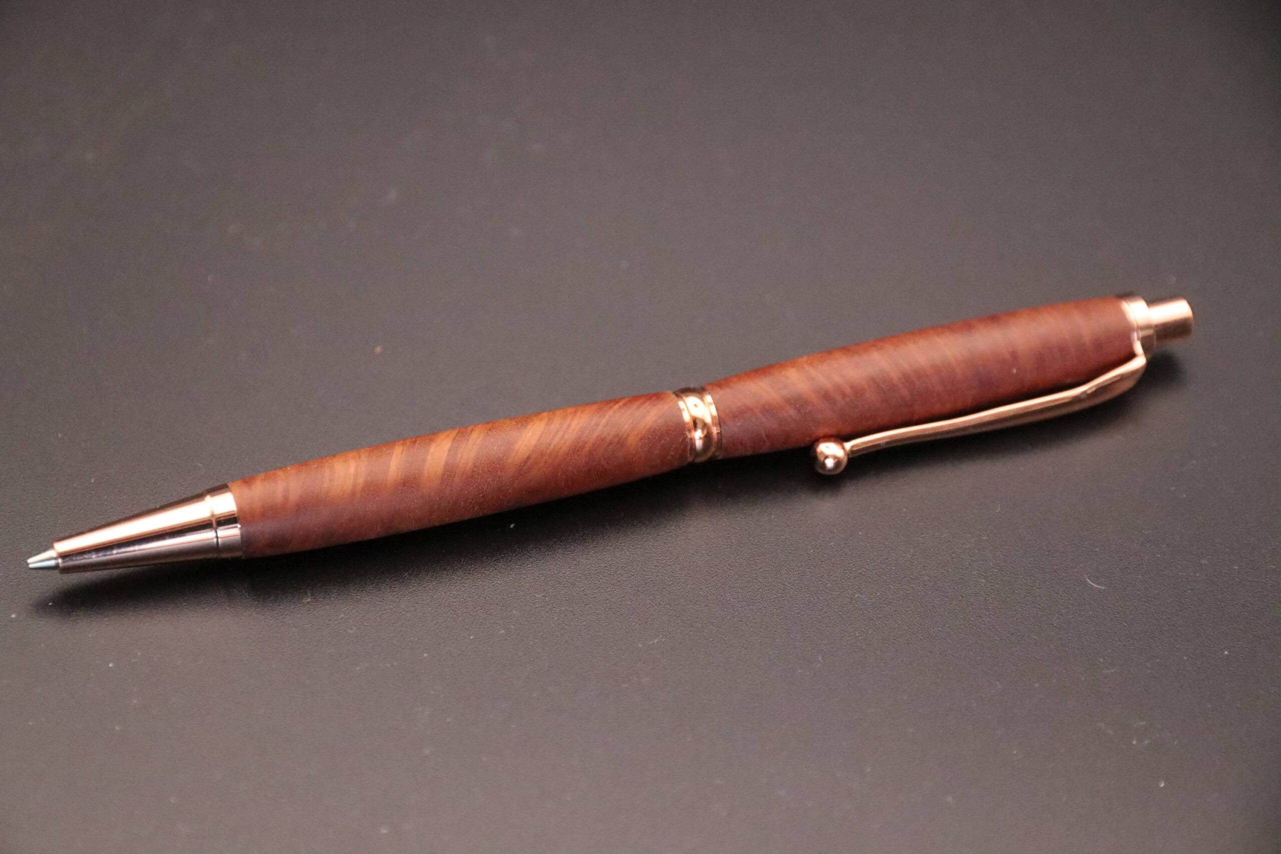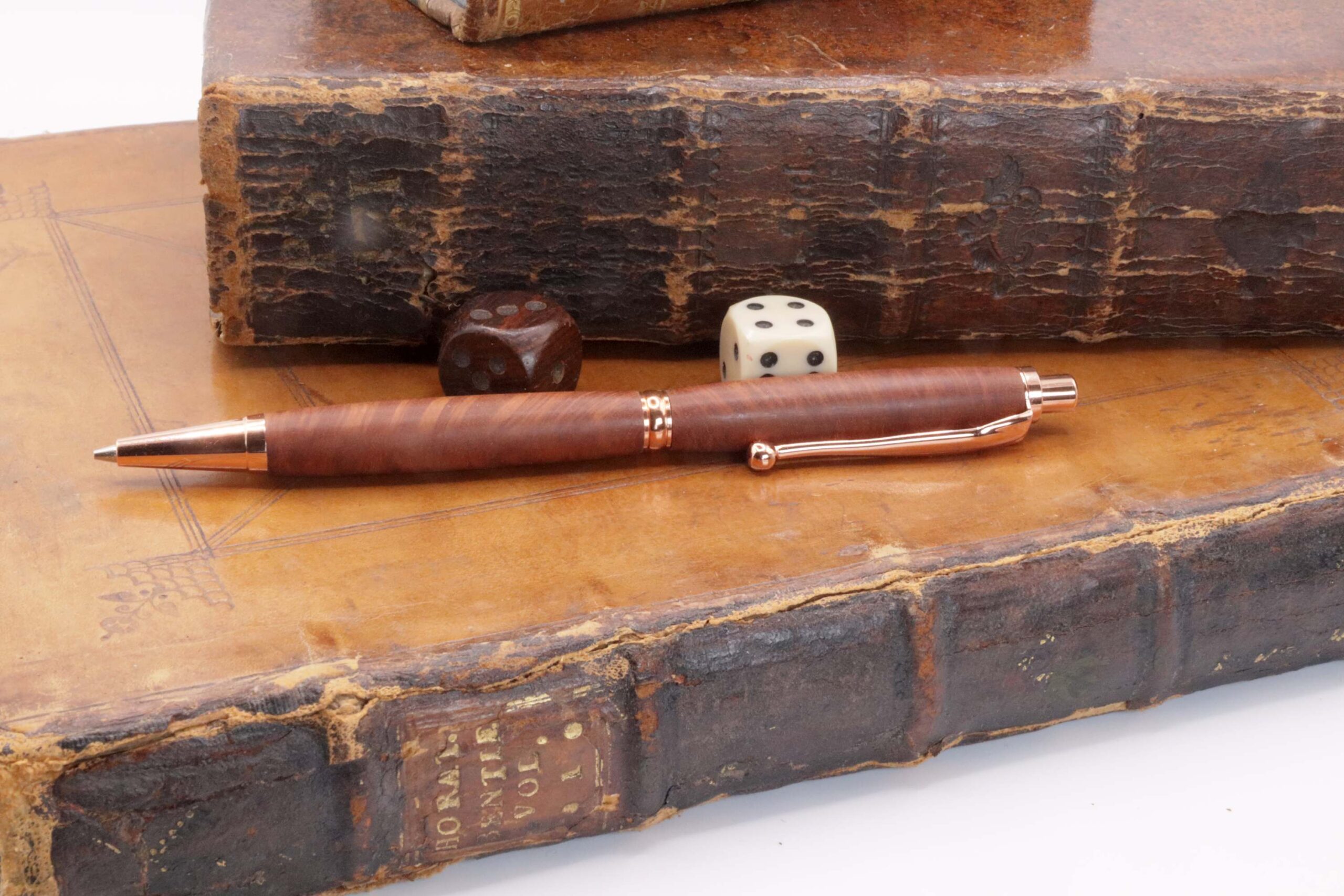 Stiftblyant i mørk mahogni med dele i rosa guld. Der stod tre støvede ‘plader’ træ bag nogle planker bagerst i savværket. Jeg skyndte mig at købe dem. De havde vist stået der i mange år. Nu lukkede savværket. Og nu bliver det til smukke penne. Det rødbrune mahogni står godt sammen med delene i rosa guld.