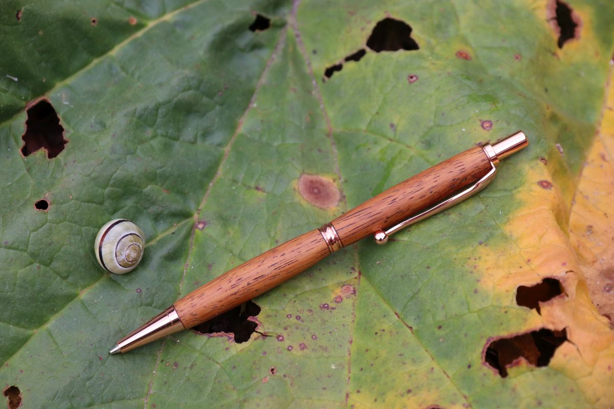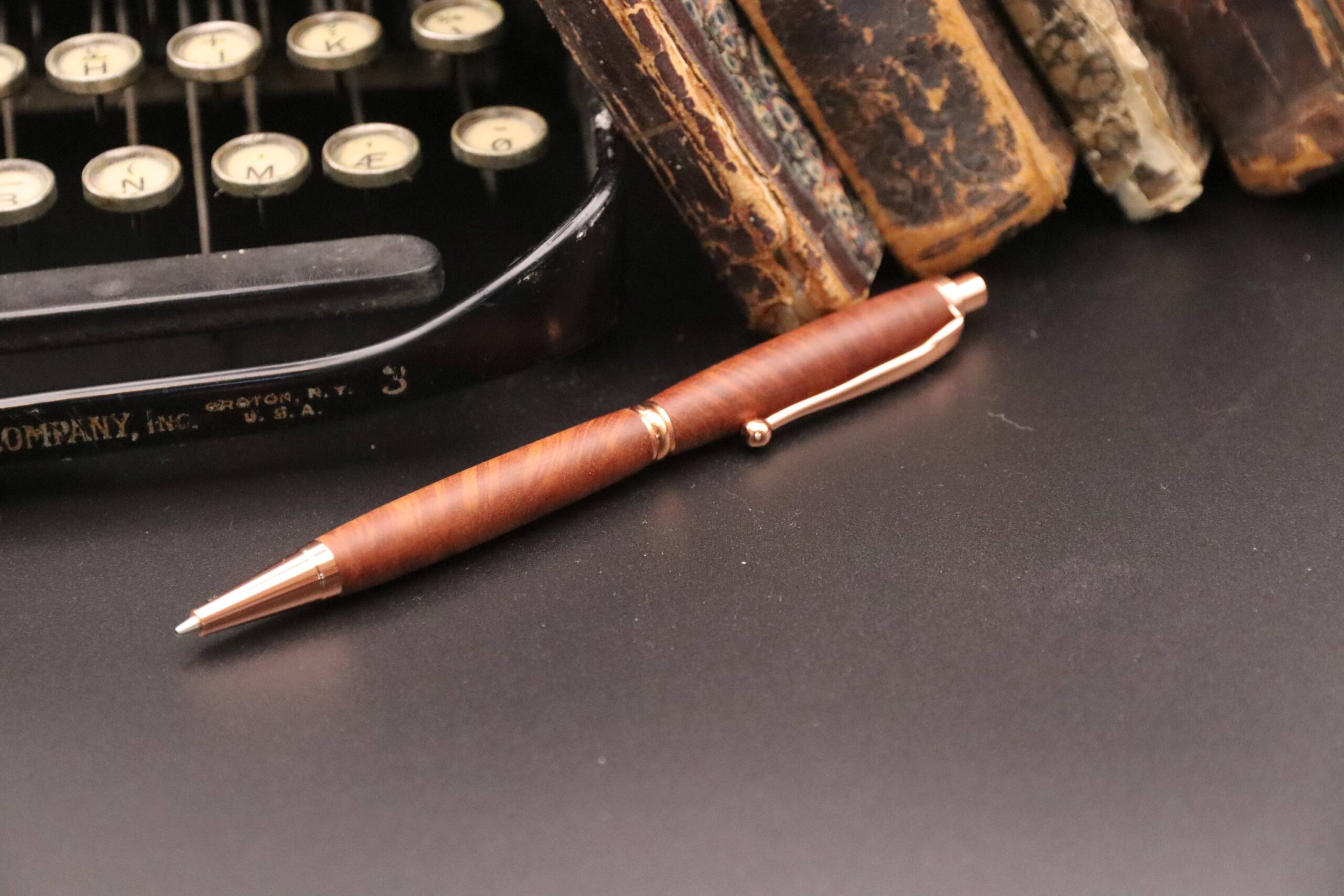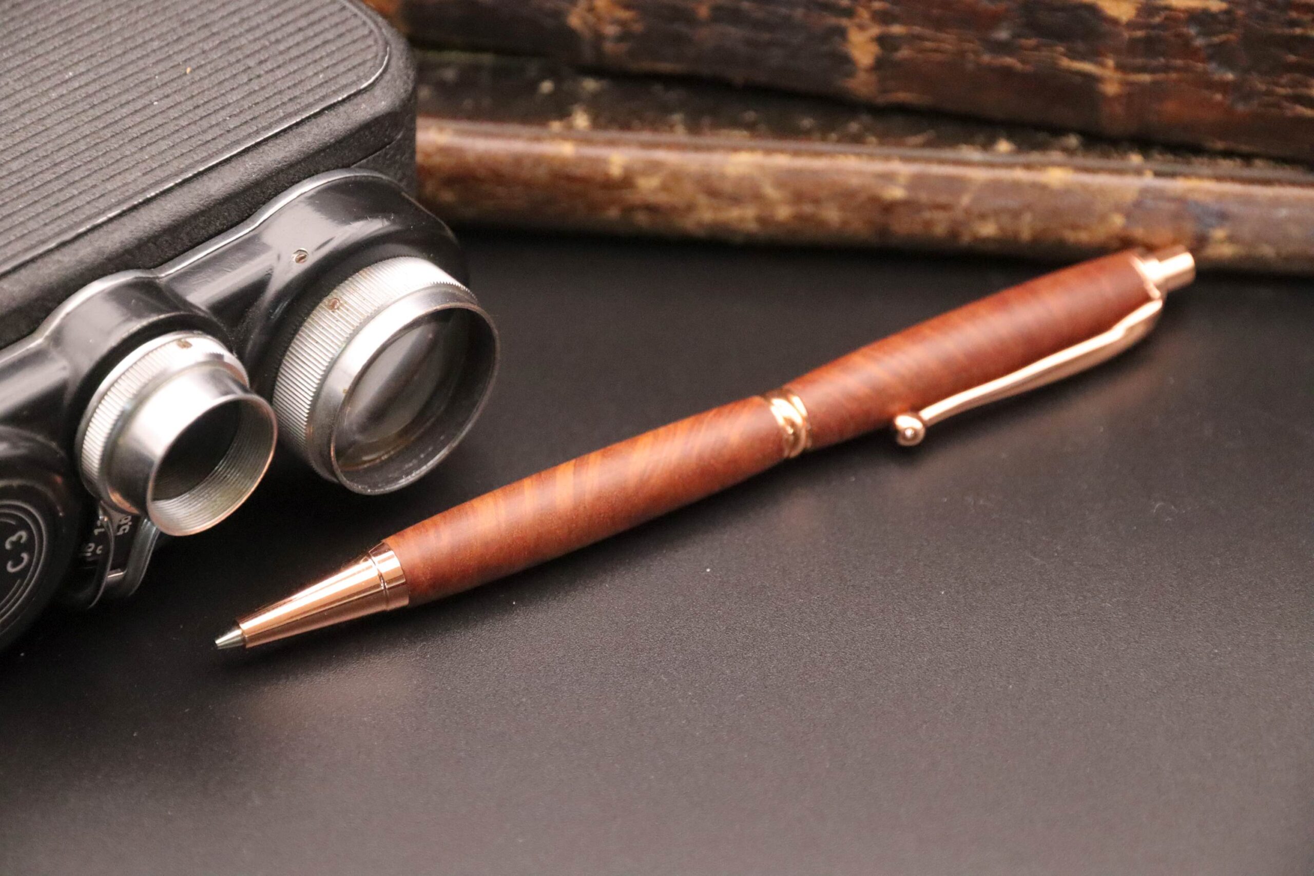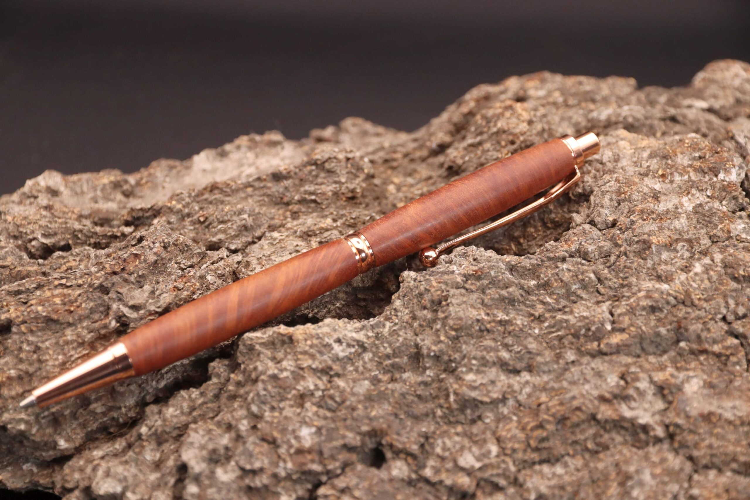 Stiftblyant i mørk mahogni med dele i rosa guld. Der stod tre støvede ‘plader’ træ bag nogle planker bagerst i savværket. Jeg skyndte mig at købe dem. De havde vist stået der i mange år. Nu lukkede savværket. Og nu bliver det til smukke penne. Det rødbrune mahogni står godt sammen med delene i rosa guld.